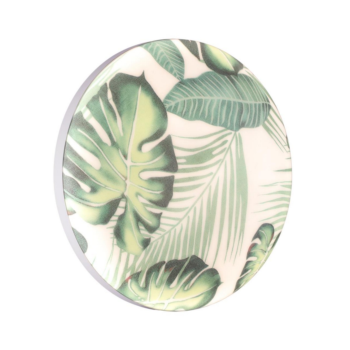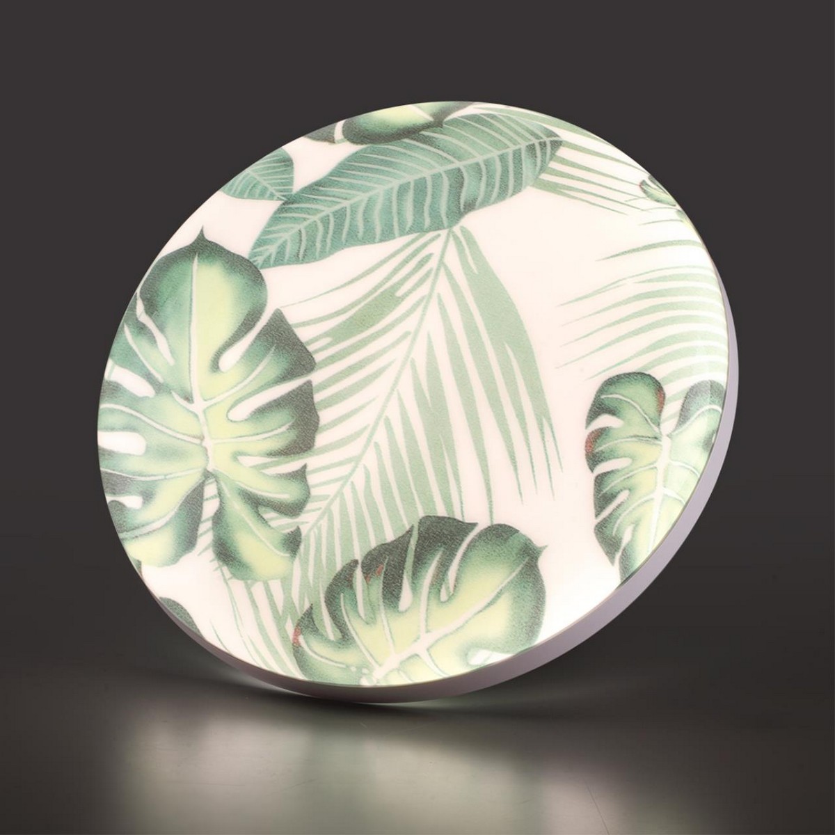 Светильник 7748/EL линии FLORI состоит из металлического основания (базы) и пластикового рассеивателя. Материал рассеивателя - высококачественный пластик марки PMMA 2.0 белого цвета с глянцевой поверхностью, обеспечивающий светильнику равномерное рассеивание и хорошее светопропускание. Форма плафона: круглая, декорирована орнаментом на плафоне с зеленым рисунком тропических листьев и съемным ободом белого цвета. Рисунок на плафоне выполнен методом цифровой печати по технологии прямого нанесения красок на акриловый лист. С целью предотвращения выцветания красок поверх рисунка наносится слой белой краски. После выдувания плафона при высоких температурах красочный рисунок приобретает стойкость и долговечность. Степень защиты IP43 позволяет использовать светильник в определенных зонах влажных помещений. В комплект входит заменяемый LED модуль с линзами, мощностью 70Вт, которая соответствует лампе накаливания 610Вт. А также пульт ДУ, с помощью которого осуществляется плавное изменение цветовой температуры 3000-600