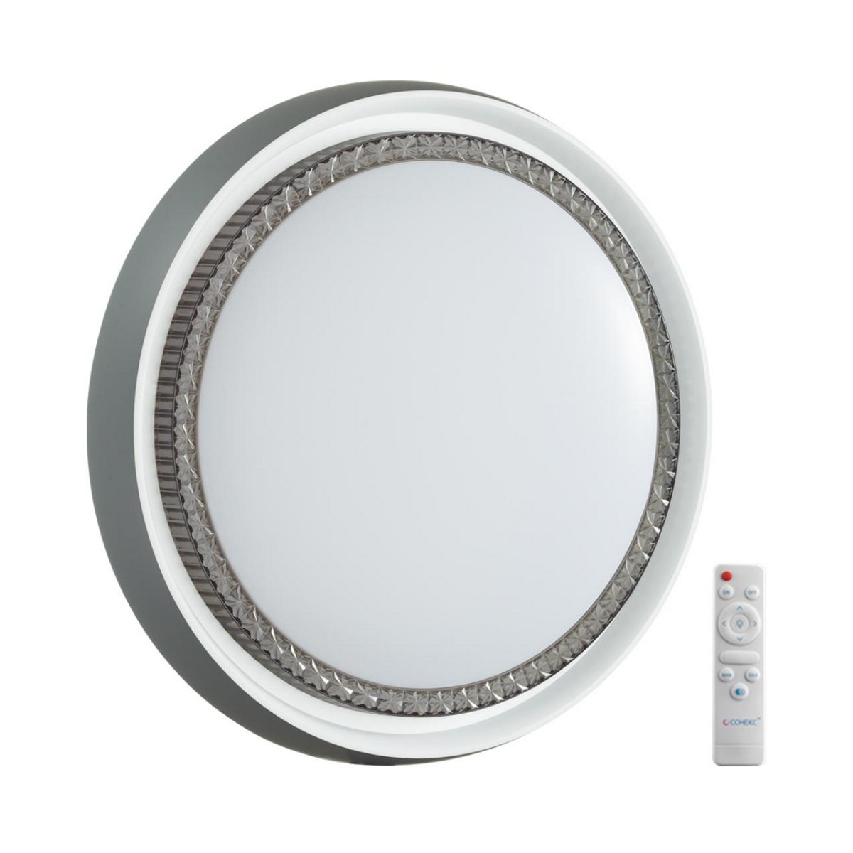 Светильник 7644/DL линии  RAHIG состоит из металлического основания (базы) и пластикового рассеивателя. Материал рассеивателя - высококачественный пластик марки PMMA 2.0 белого цвета с матовой поверхностью. Пластик обеспечивает светильнику равномерное рассеивание и хорошее светопропускание. Материал обода - пластик серого цвета с внешней стороны, белого цвета с внутренней стороны.Форма плафона: круглая, декорирована вставкой"под хрусталь" из прозрачного пластика дымчатого цвета. Степень защиты IP43 позволяет использовать светильник в определенных зонах влажных помещений. В комплект входит заменяемый LED модуль с линзами, мощностью 70Вт, которая соответствует лампе накаливания 610Вт. А также пульт ДУ (с креплением на стену), с помощью которого осуществляется плавное изменение цветовой температуры 3000-6000К, изменение яркости, переход в режим переключения теплого/белого/холодного/ночного света. Светильник имеет функцию "память".