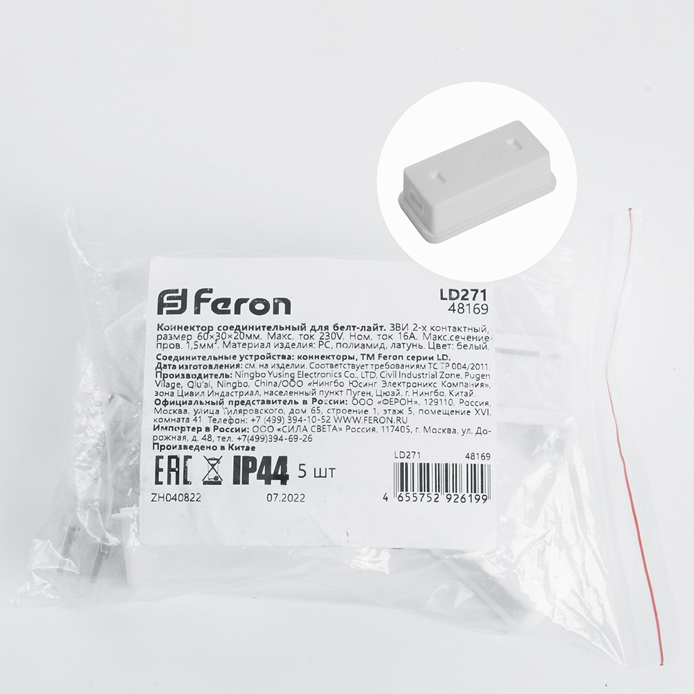 Соединительные устройство коннектор, FERON, LD271 (48169) , сечение проводников 1,5мм2, IP44, 230V, 16А, У1, материал: пластик, сплав латуни, размер (60* 30* 20мм),
