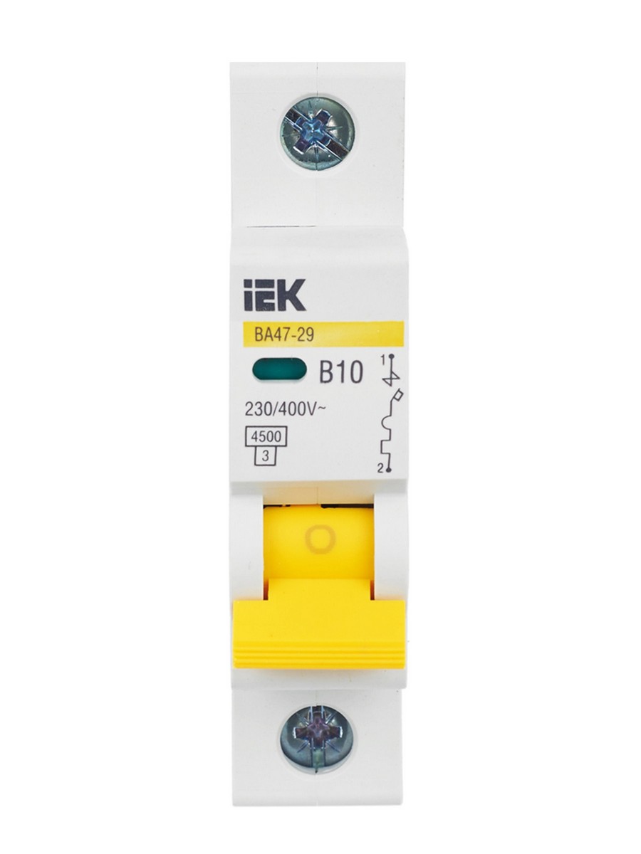Автоматический выключатель IEK KARAT ВА47-29 1Р 10А 4,5кА (артикул MVA20-1-010-B) обеспечивает надежную защиту распределительных и групповых цепей. Подходит для электроприборов и освещения (характеристика В), небольших пусковых токов (характеристика C) и больших пусковых токов (характеристика D). Рекомендуется для вводно-распределительных устройств в жилых и общественных зданиях. Номинальный ток: 10А.