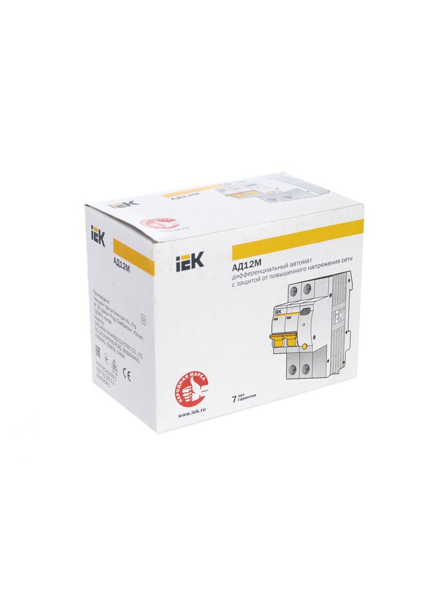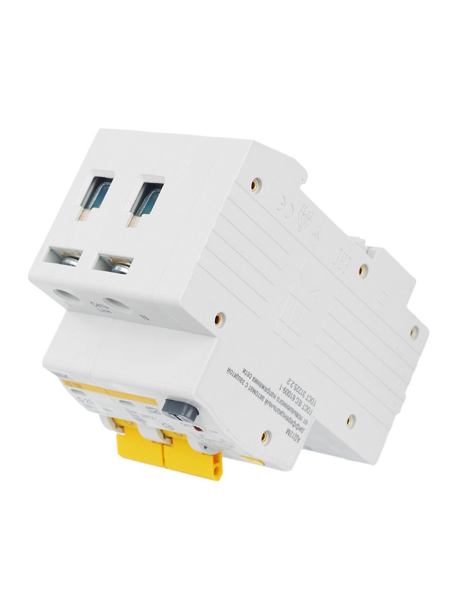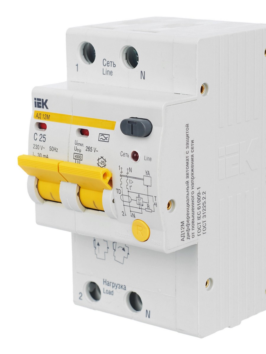 Дифференциальный автоматический выключатель IEK KARAT АД12М 2Р С25 30мА (артикул: MAD12-2-025-C-030) предназначен для защиты людей от поражения электрическим током и предотвращения пожаров. Обеспечивает срабатывание при токах утечки 10, 30 и 100 мА, а также защиту от перегрузок и коротких замыканий. Индикация срабатывания и состояния устройства осуществляется с помощью светодиодов. Устойчив к снижению напряжения до 110 В. Номинальный ток 25A, максимальный ток отключения 30mA. Использует современные автоматические выключатели ВА47-29.