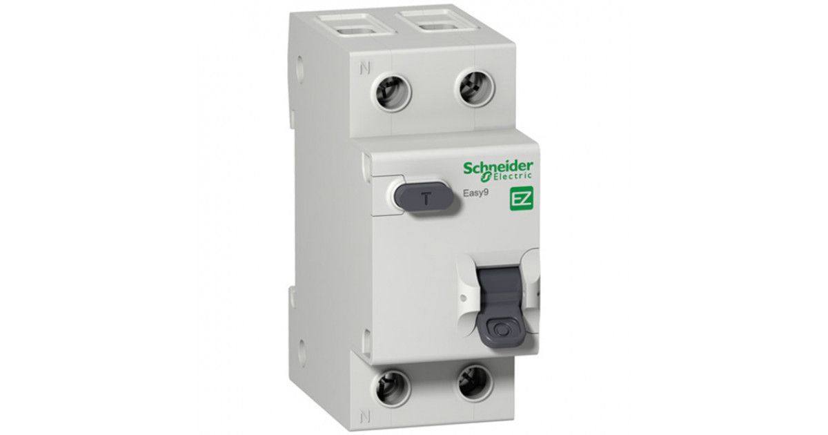 Двухполюсное устройство защитного отключения (УЗО) серии Easy9 от Schneider Electric, предназначенное для однофазных сетей до 230В.
