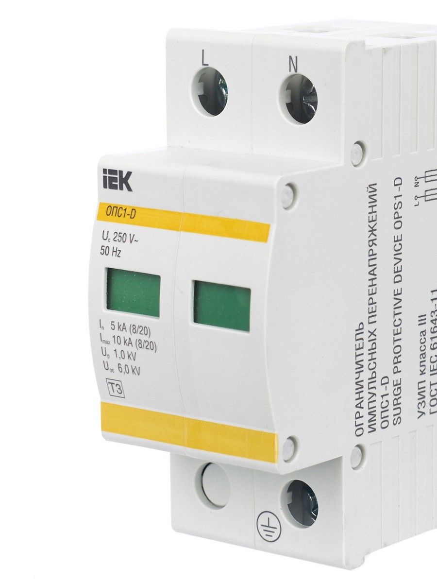 Ограничитель перенапряжения IEK KARAT ОПС1-D 2Р защищает распределительные цепи жилых и общественных зданий от грозовых и коммутационных импульсных перенапряжений. Номинальный ток 5 кА, максимальный импульсный ток 10 кА, рабочее напряжение 230 В. Компактный и надежный, обеспечивает безопасность электрооборудования.