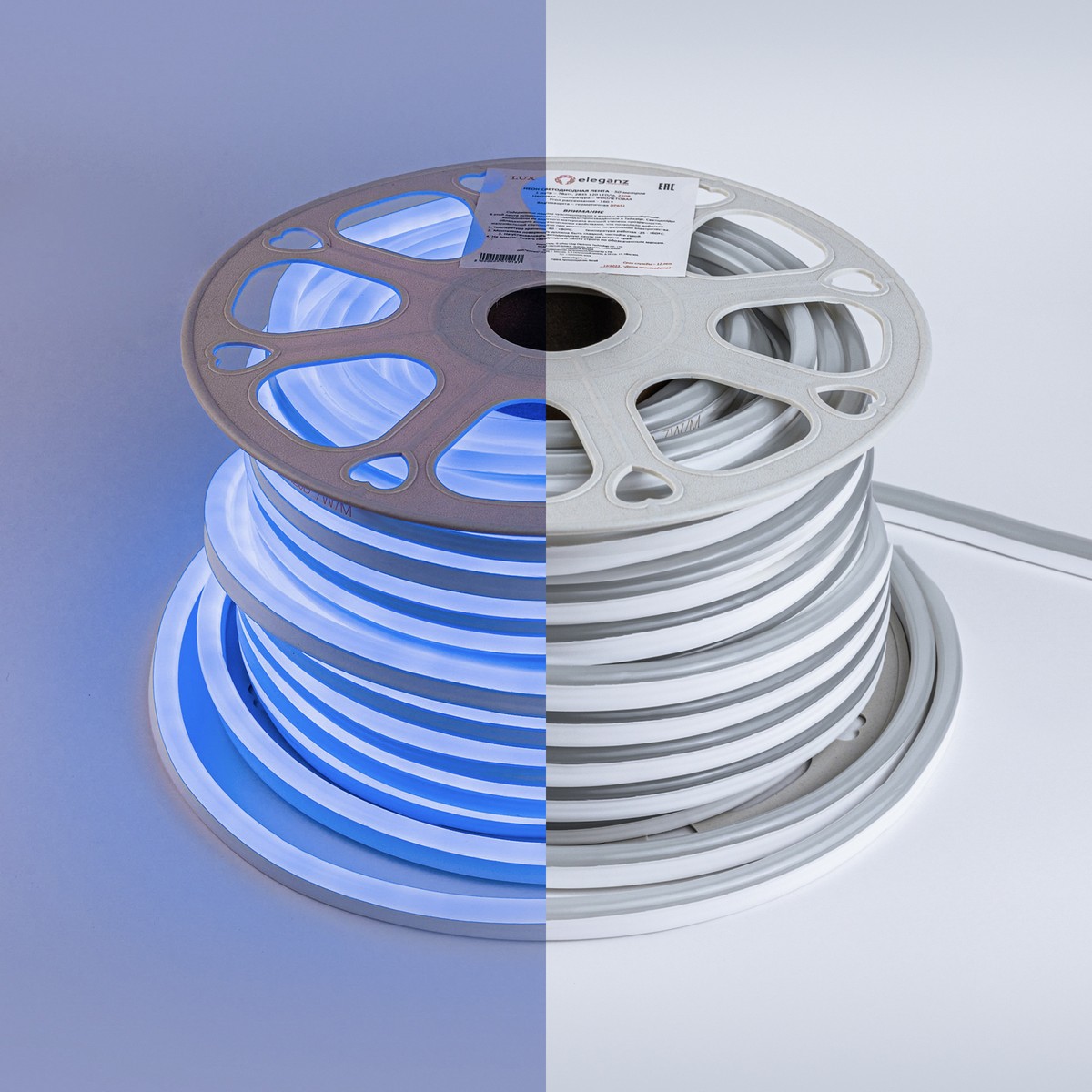 Гибкий неон ELEGANZ 220В 9Вт/м Синий (артикул EL-N220-9B) – идеальное решение для создания эффектной подсветки в интерьере и экстерьере. С шагом резки 10 см, он легко адаптируется под любые дизайнерские проекты, включая освещение потолков, ниш и витрин. Обеспечивает влагозащиту (IP65), что делает его подходящим для ванных комнат, кухонь и уличных конструкций.