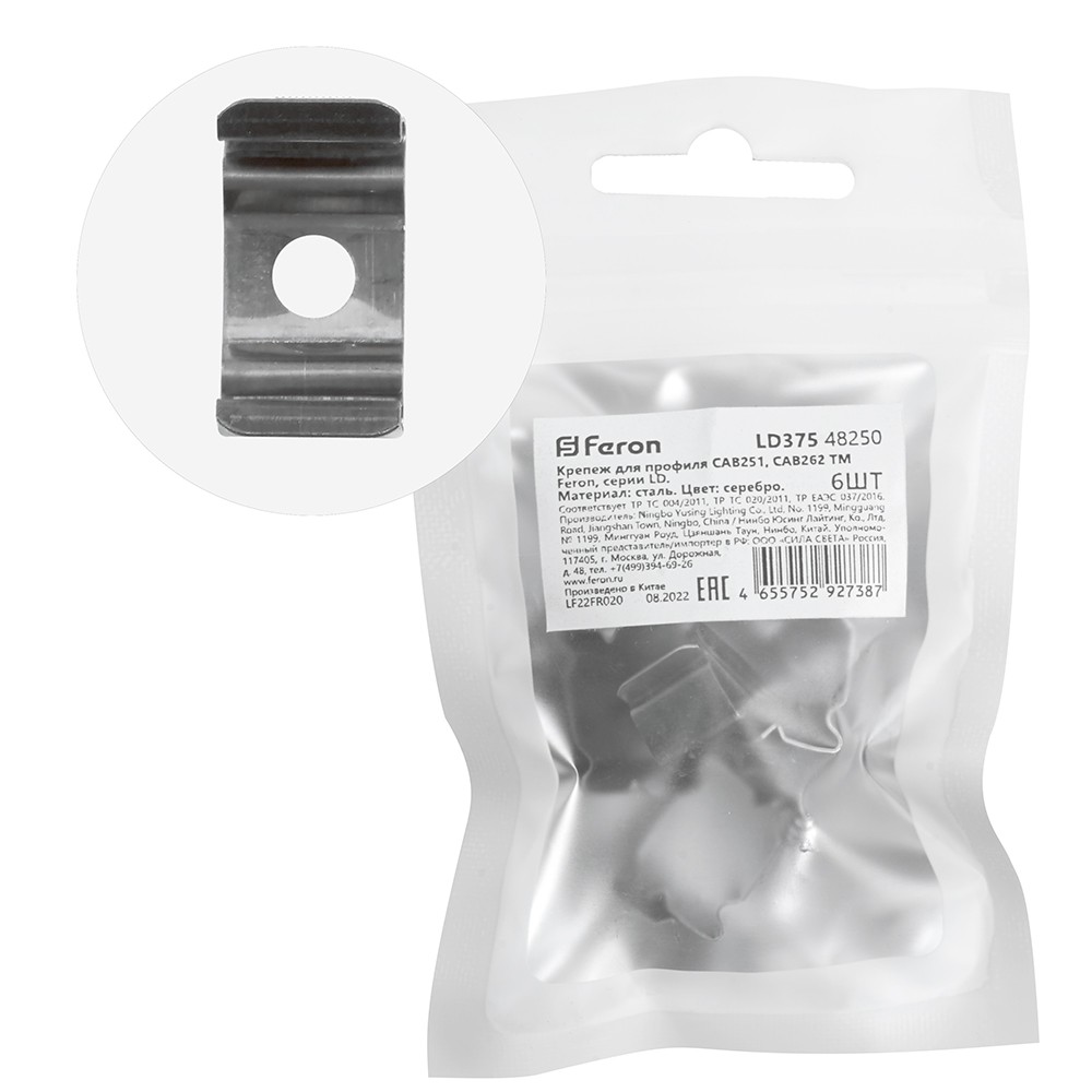 Крепеж для профиля САВ251 CAB262 LD375 предназначен для надежной установки накладных низких светильников Feron LD375. Комплект из 6 штук выполнен в серебристом цвете, размеры 15*8*9 мм обеспечивают универсальность и легкость монтажа. Идеален для использования в жилых и коммерческих помещениях.