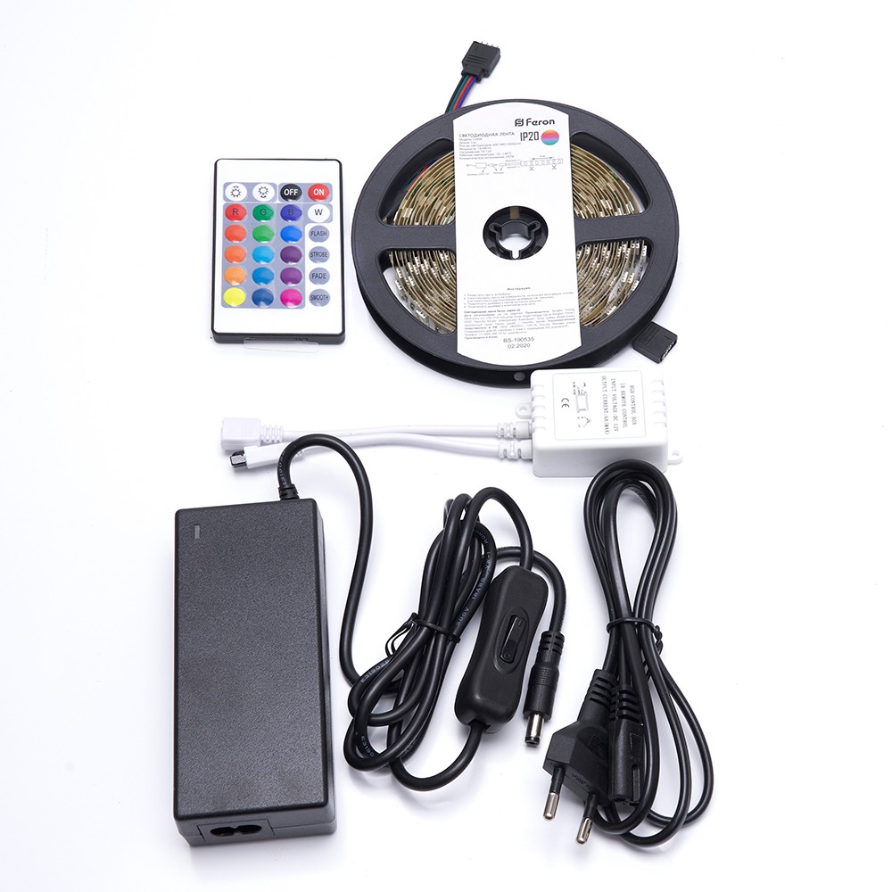 Лента светодиодная Feron LS606 60SMD(5050)/м 14.4Вт/м 12V IP20 RGB 5 метров (комплект с адаптером, контроллером, вилкой и пультом) 27706 по цене 1 699 руб. с фотографией и техническими характеристиками. Для покупки товара нажмите кнопку "Купить" и перейдите в корзину или позвоните по телефону 8 (495) 585 32 60 или 8 (800) 222 23 53.
