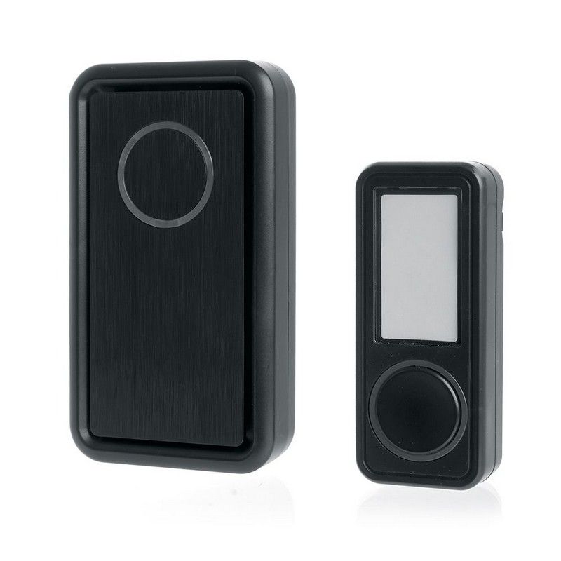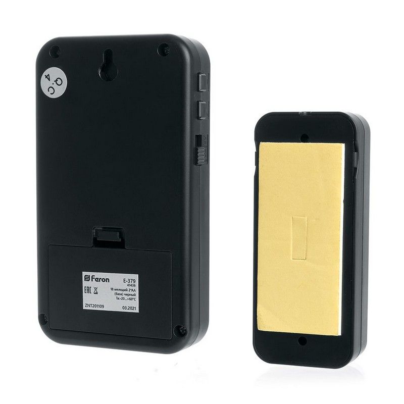 Звонок электрический дверной беспроводной FERON E-379, 18 мелодий, дальность действия 100м, цвет черный, шифрование сигнала - есть; БАЗА: 2*1,5V/AA, 123*70*23 мм, КНОПКА: IP44, 1 * CR2032 (в комплекте) , раб.t -20..+60°С , размер кнопки 38*22*92мм