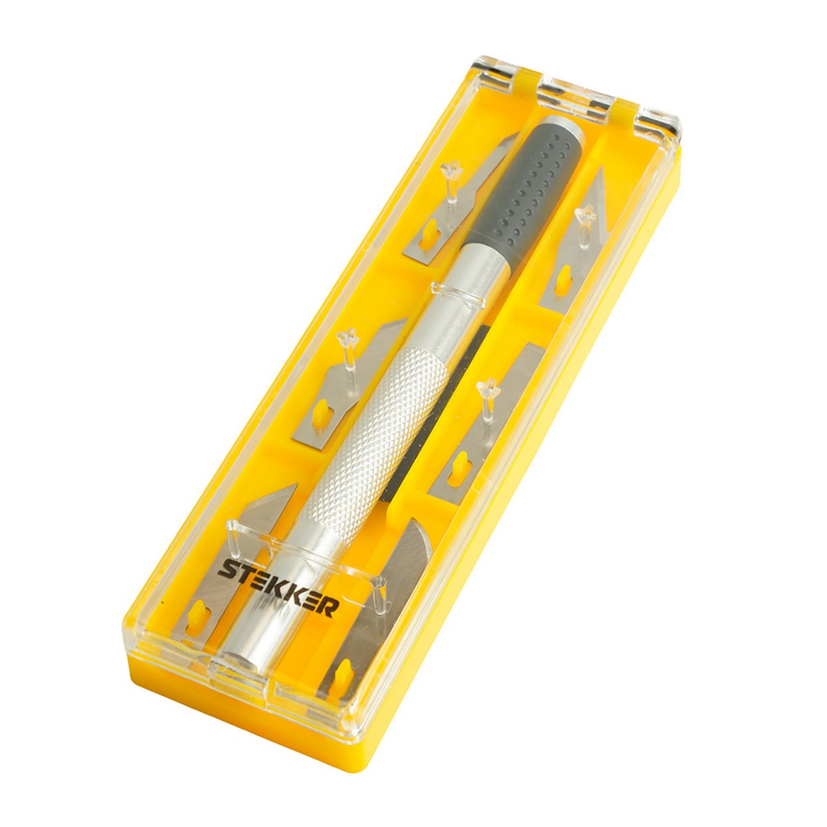 KMU-41-S Нож макетный с алюминиевой рукояткой, 0,5 мм, кейс, 6 лезвий в комплекте, STEKKER