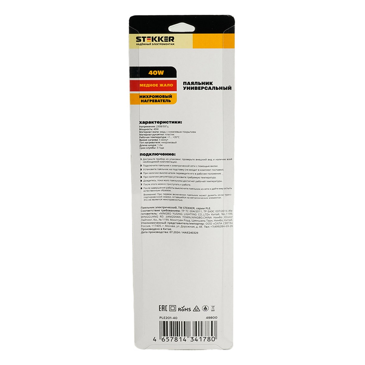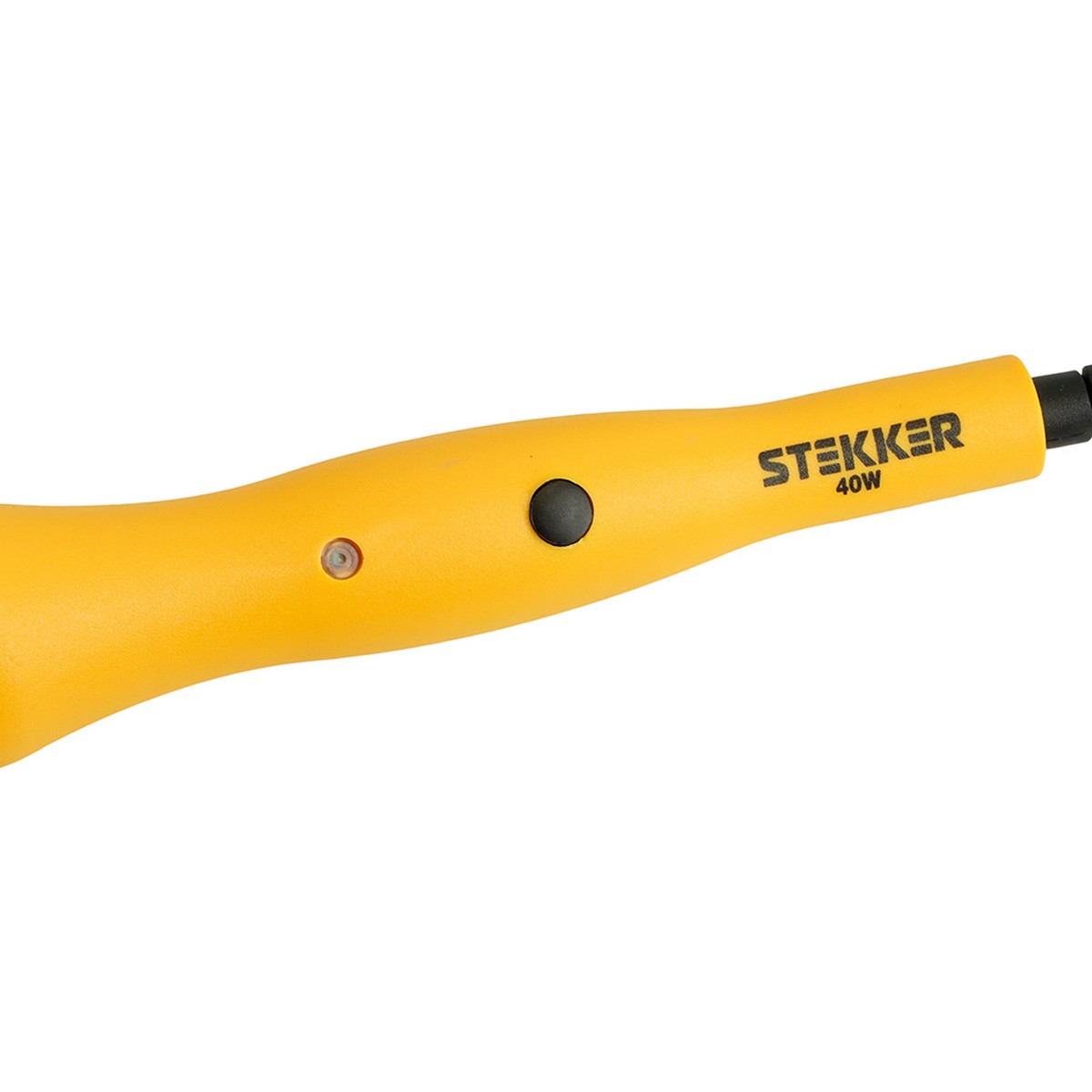 Паяльник STEKKER PLE201- 40 40W с кнопкой вкл., нихромовый нагреватель, долговечное жало, 230В 49800 по цене 313 руб. с фотографией и техническими характеристиками. Для покупки товара нажмите кнопку "Купить" и перейдите в корзину или позвоните по телефону 8 (495) 585 32 60 или 8 (800) 222 23 53.