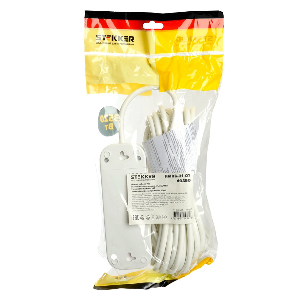 Удлинители STEKKER 49350, серия Home, цвет белый, длина 7 м, количество розеток 3, сталь, сечение кабеля 1 мм2, тип кабеля ПВС, материал кабеля -, ток 16А, напряжение 250В, максимальная нагрузка 3520Вт, тип вилки - прямая. Диапазон рабочих температур +1..+35°C, степень защиты IP20, класс защиты от поражения эл. током 1, размеры изделия -*-*-. Гарантия 1 год.