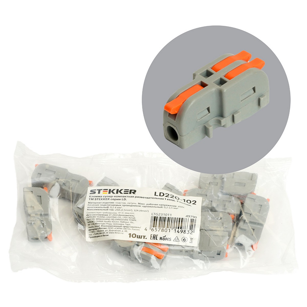 Клемма пружинная компактная STEKKER LD220-102, 3-проводная 0,2-4мм2, 450В, 32А, без пасты, материал изделия полиамид 6.6, латунь. Тип провода одножильный/многожильный, материал провода медь, температура окружающей среды -20...+40°C