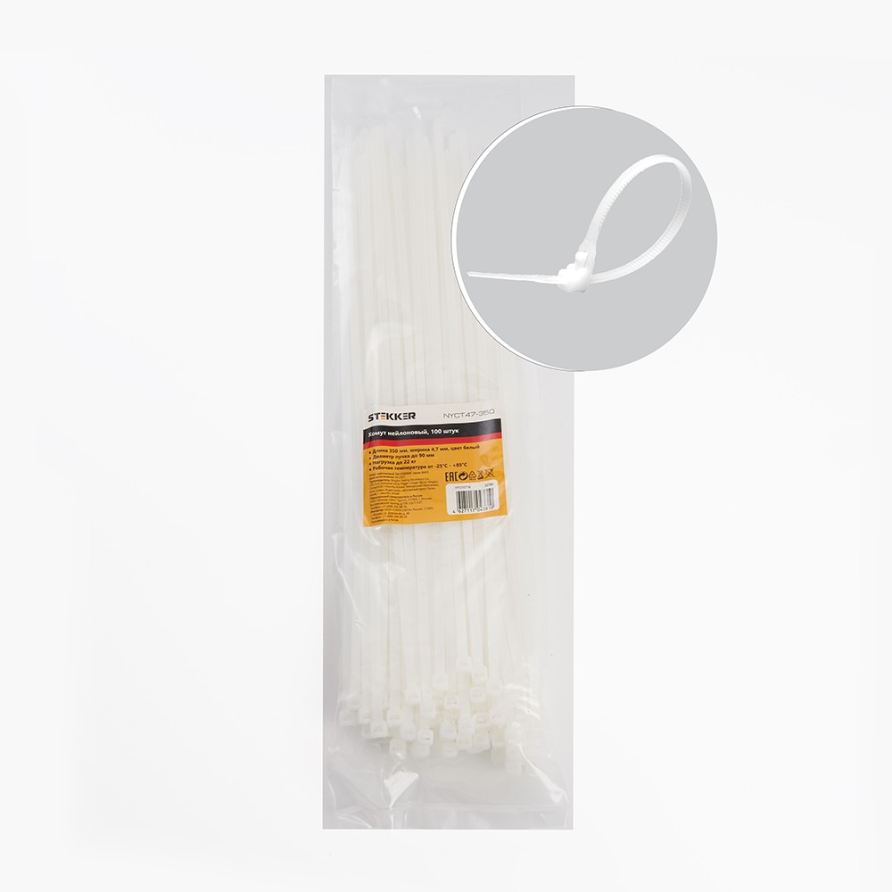 Хомут электромонтажный STEKKER NYCT47-350 , одноразовый, белый, материал - нейлон , максимальный диаметр пучка - 90мм, нагрузка - 22кг, диапазон рабочих температур -25°C - +85°C, рекомендуемая температура хранениня +5°C - +25°C