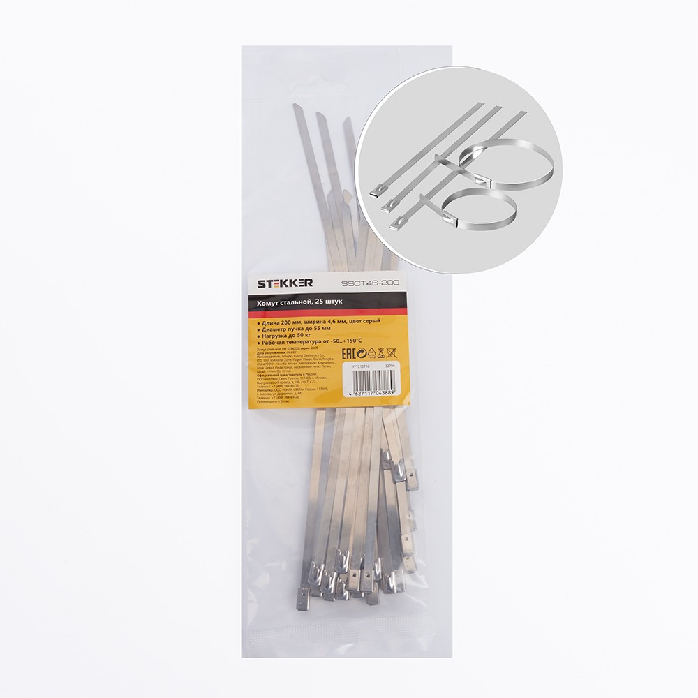 Хомут электромонтажный STEKKER SSCT46-200, одноразовый, серый, материал - сталь, максимальный диаметр пучка - 55мм, нагрузка - 50кг, диапазон рабочих температур -80..+538°C, рекомендуемая температура хранениня -