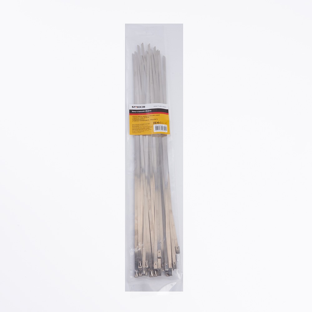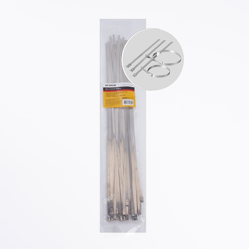 Хомут электромонтажный STEKKER SSCT46-400, одноразовый, серый, материал - сталь, максимальный диаметр пучка - 121мм, нагрузка - 50кг, диапазон рабочих температур -80..+538°C, рекомендуемая температура хранениня -