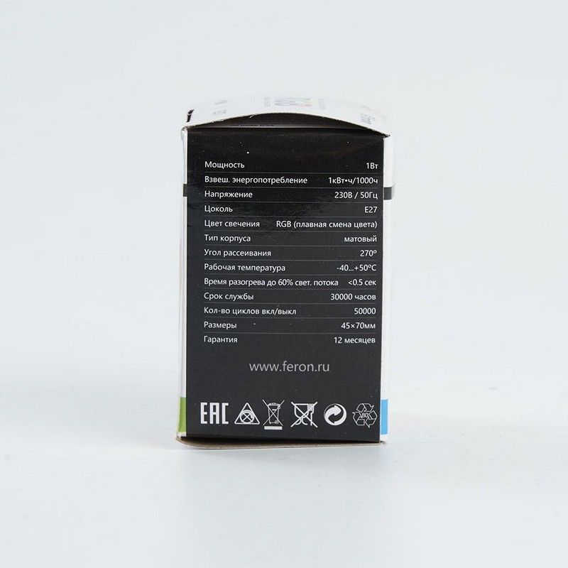 Лампа светодиодная Feron LB-37 Шарик матовый E27 1W RGB плавная сменая цвета 38116 по цене 88 руб. с фотографией и техническими характеристиками. Для покупки товара нажмите кнопку "Купить" и перейдите в корзину или позвоните по телефону 8 (495) 585 32 60 или 8 (800) 222 23 53.