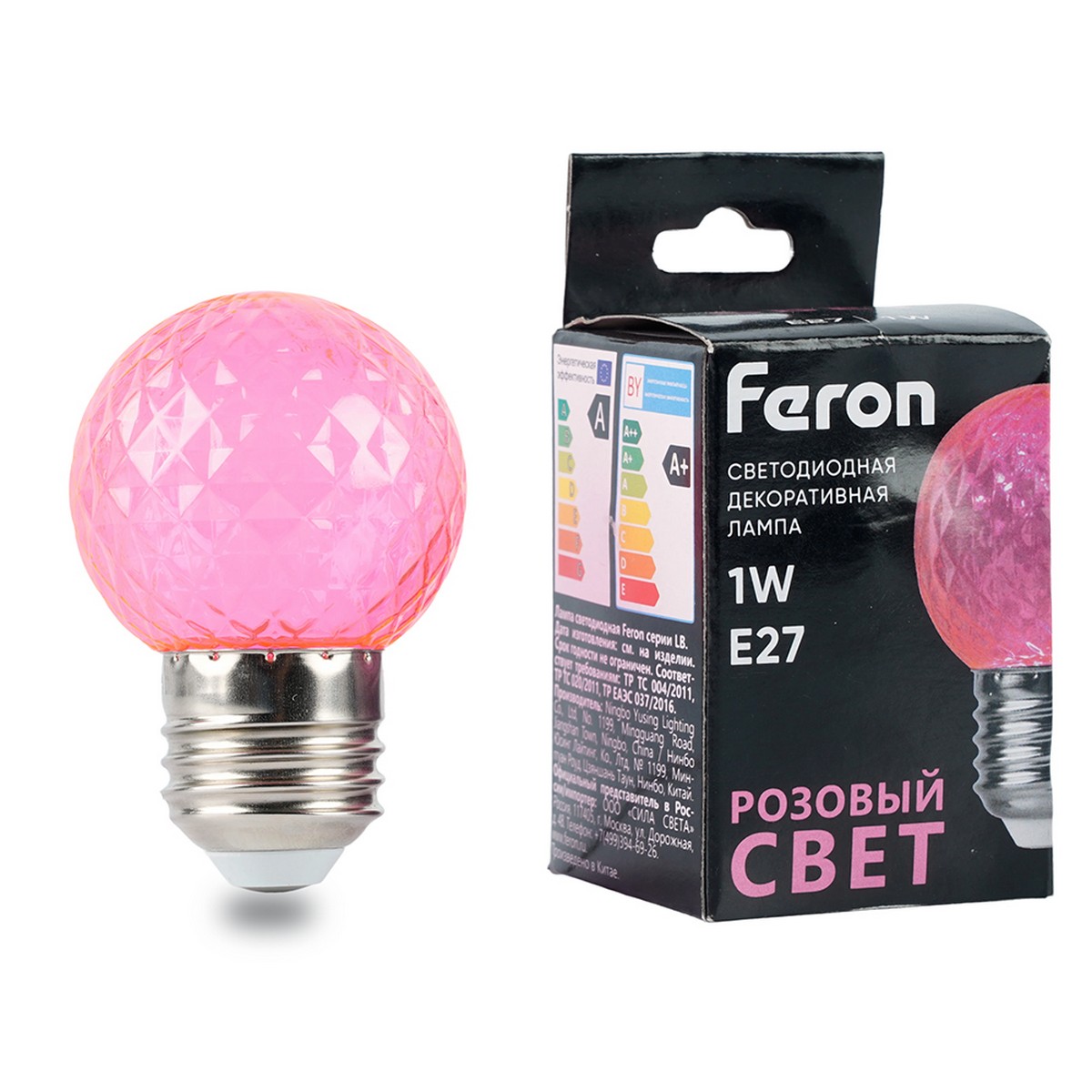Лампа светодиодная FERON LB-385, G45 (шар), 1W 230V E27 (розовый), рассеиватель прозрачный розовый, угол рассеивания 270°, корпус пластик, 68*45мм