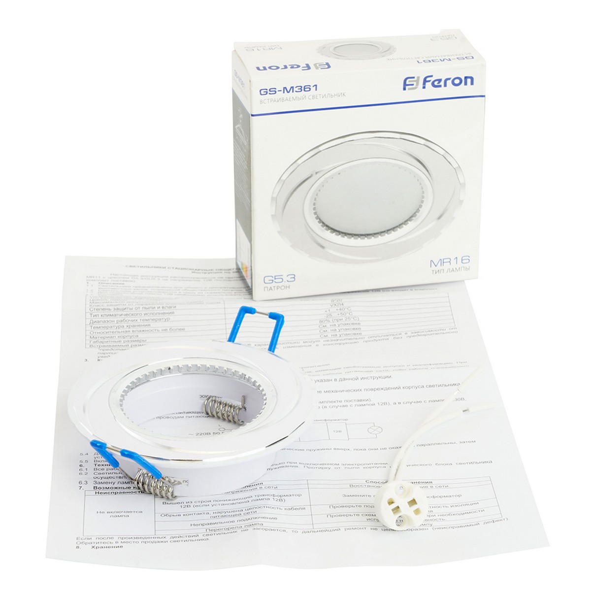 Светильник встраиваемый Feron GS-M361 потолочный белый MR16 G5.3 28344 по цене 121 руб. с фотографией и техническими характеристиками. Для покупки товара нажмите кнопку "Купить" и перейдите в корзину или позвоните по телефону 8 (495) 585 32 60 или 8 (800) 222 23 53.