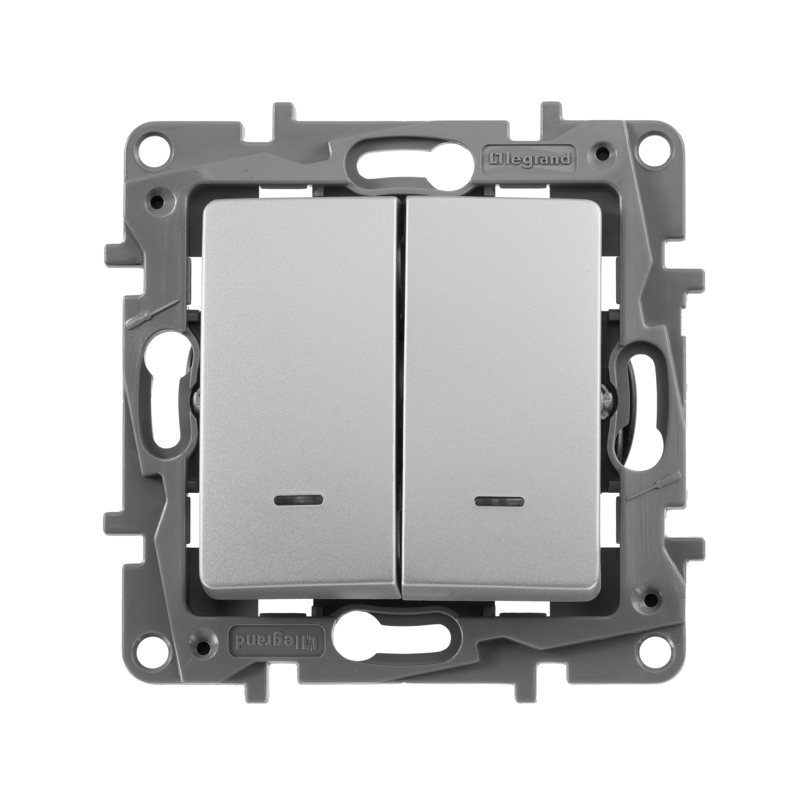 Выключатель с подсветкой двухклавишный Legrand Etika для скрытого монтажа, номинальный ток 10 А, цвет алюминий. Предназначен для управления двумя электрическими цепями.Особенности:- Лампы подсветки светодиодные (2 шт.) заменяемые, цвет подсветки- белый.- Благодаря изменяемой схеме подключения, лампа подсветки либо облегчает ориентирование в темноте, либо информирует о включении нагрузки. - Материал клавиши глянцевый AБС пластик- стоек к выгоранию и загрязнениям. - Ход клавиш короткий, не громкий- Все токоведущие части выключателя имеют защиту от случайного прикосновения. - Безвинтовые зажимы для присоединения проводов не требуют обслуживания.Особенности серии Etika:- Корпус механизма- высококачественный поликарбонат, не проводит электрический ток, не поддерживает горение. - Специальный профиль внешнего контура механизма обеспечивает простоту и безошибочность многопостового монтажа. - Острые крепёжные лапки с широким углом раскрытия обеспечивают надёжную фиксацию в монтажной коробке.