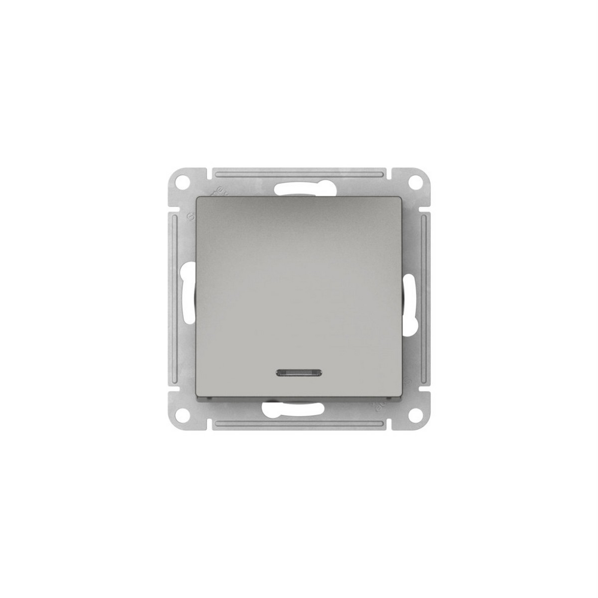 Механизм с быстрозажимными клеммами 1-клавишного выключателя в сборе Systeme Electric (ранее Schneider Electric) серии AtlasDesign в цвете сталь подходит для сетей 250 В, на ток 10 А.
