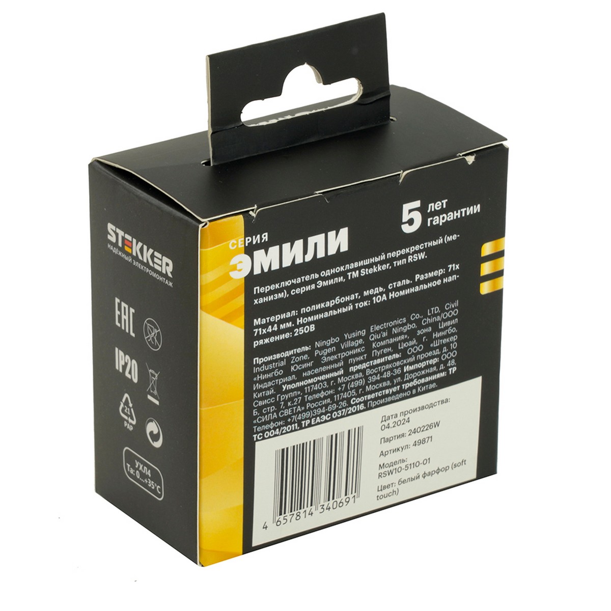 Конструкция переключателя изготовлена из качественных материалов: токоведущая часть выполнена из оловяннофосфорной бронзы, внутренний блок — из полиамида 6.6, а прочный корпус из поликарбоната не поддерживает горение, что гарантирует дополнительную безопасность. Выбор данного переключателя обеспечит надежную работу с номинальным напряжением 250 В и током 10 А. Стиль, безопасность и надежность — ключевые преимущества переключателя STEKKER Эмили, который станет отличным дополнением вашего дома.