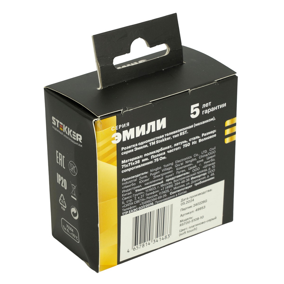 Розетка телевизионная 1-ая STEKKER RST00-5108-10 обеспечивает надежное подключение телевизионного оборудования с импедансом 75 Ом и диапазоном частот до 862 МГц. Выполненная в стильном платиново-сером цвете с мягкой текстурой Soft Touch, она гармонично впишется в любой интерьер. Простота установки и высокая качество передачи сигнала делают эту розетку отличным выбором для домашнего кинотеатра или современного жилья.
