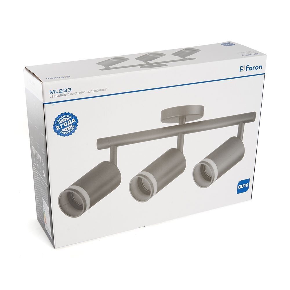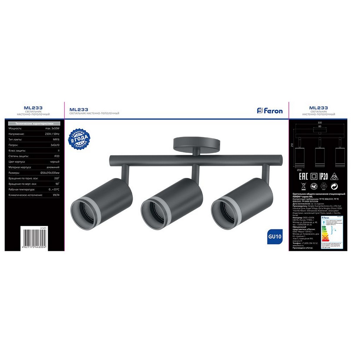 Современный светильник спот создаст уютное освещение в любом интерьере. Можно использовать как основное или акцентное освещение в любом помещении. Модель ML233 от производителя Feron в цвете Черный и типом лампы GU10 которая обеспечивает мощность 150 Ватт обеспечит Вас качественным светом. А универсальный крепеж (в комплекте) позволяет установить светильник на любую поверхность. Светильник накладной под лампу, (ИВО) FERON ML233, 3*GU10 3*50W, 230V, IP20, цвет черный, корпус алюминий, 300*56*210