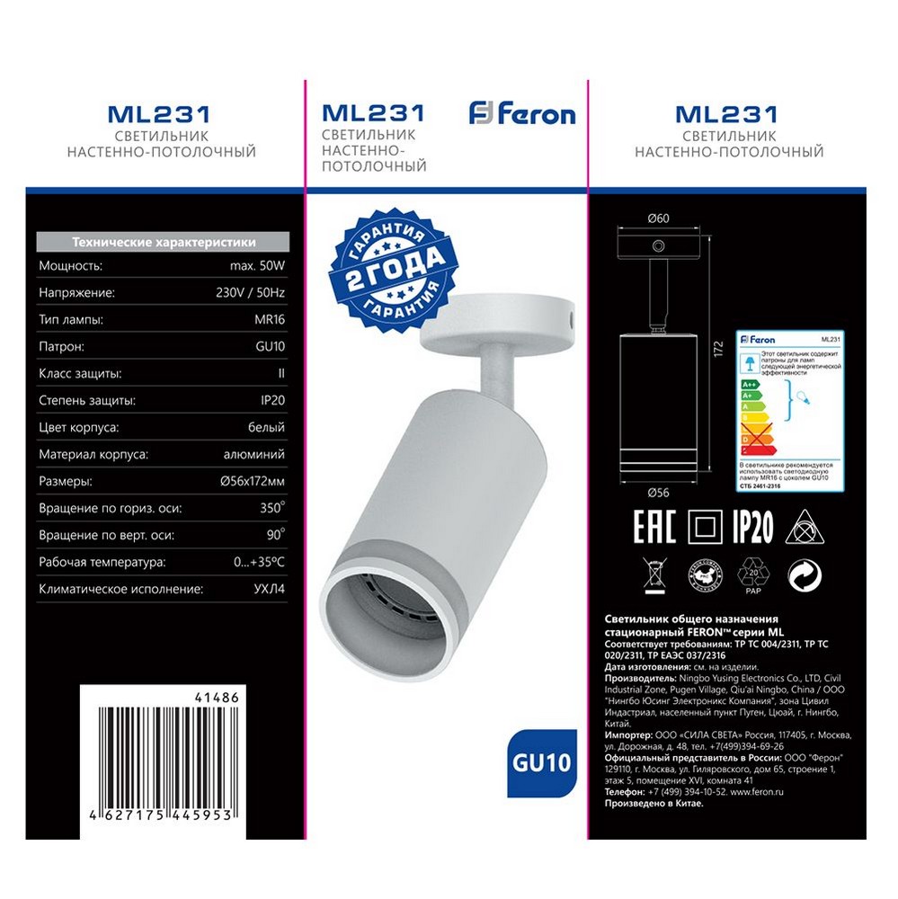 Светильник спот Feron ML231 настенно-потолочный GU10 белый 41486 по цене 558 руб. с фотографией и техническими характеристиками. Для покупки товара нажмите кнопку "Купить" и перейдите в корзину или позвоните по телефону 8 (495) 585 32 60 или 8 (800) 222 23 53.