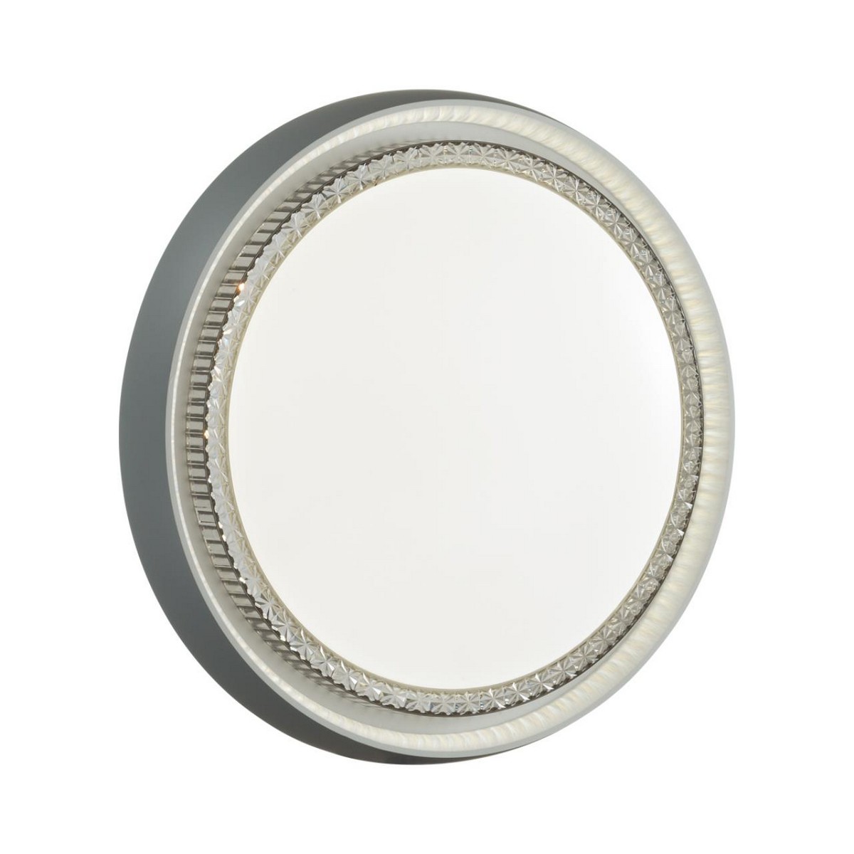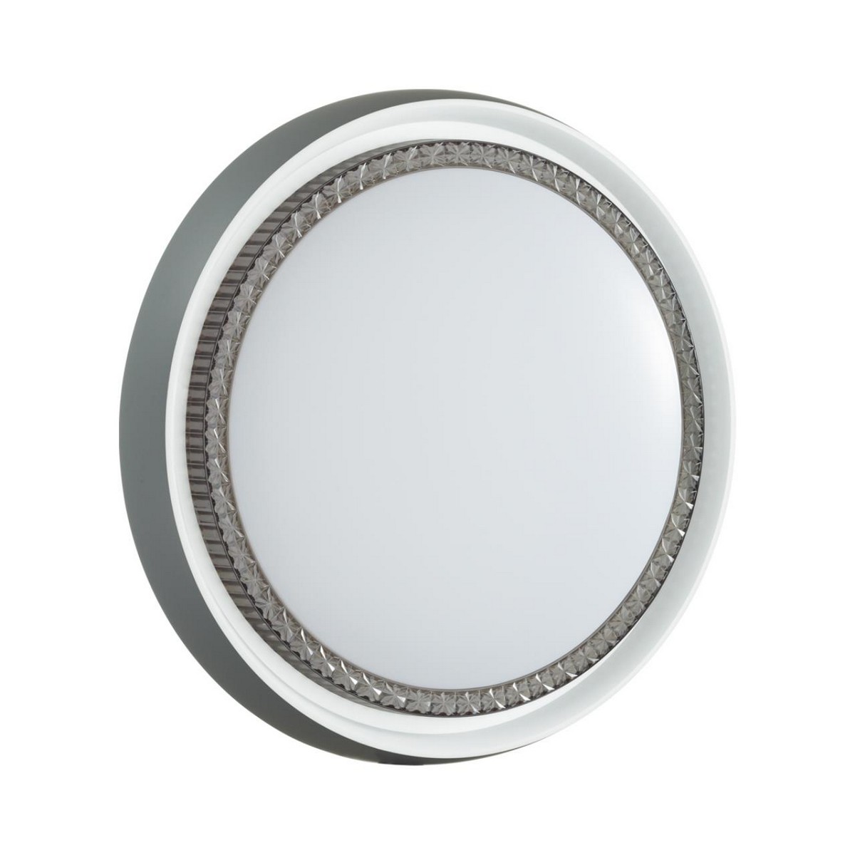 Светильник 7644/DL линии RAHIG состоит из металлического основания (базы) и пластикового рассеивателя. Материал рассеивателя - высококачественный пластик марки PMMA 2.0 белого цвета с матовой поверхностью. Пластик обеспечивает светильнику равномерное рассеивание и хорошее светопропускание. Материал обода - пластик серого цвета с внешней стороны, белого цвета с внутренней стороны. Форма плафона: круглая, декорирована вставкой "под хрусталь" из прозрачного пластика дымчатого цвета. Степень защиты IP43 позволяет использовать светильник в определенных зонах влажных помещений. В комплект входит заменяемый LED модуль с линзами, мощностью 48Вт, которая соответствует лампе накаливания 460Вт. Источник света имеет комфортную цветовую температуру 4000К (белый свет).