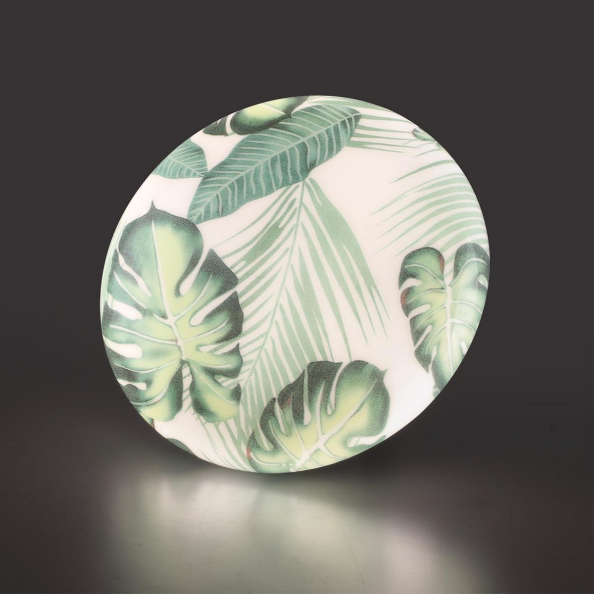 Светильник 7748/СL линии FLORI состоит из металлического основания (базы) и пластикового рассеивателя. Материал рассеивателя - высококачественный пластик марки PMMA 2.0 белого цвета с глянцевой поверхностью, обеспечивающий светильнику равномерное рассеивание и хорошее светопропускание. Форма плафона: круглая, декорирована орнаментом на плафоне с зеленым рисунком тропических листьев и съемным ободом белого цвета. Рисунок на плафоне выполнен методом цифровой печати по технологии прямого нанесения красок на акриловый лист. С целью предотвращения выцветания красок поверх рисунка наносится слой белой краски. После выдувания плафона при высоких температурах красочный рисунок приобретает стойкость и долговечность. Степень защиты IP43 позволяет использовать светильник в определенных зонах влажных помещений. В комплект входит заменяемый LED модуль с линзами, мощностью 30Вт, которая соответствует лампе накаливания 270Вт. Источник света имеет комфортную цветовую температуру 4000К (белый свет).