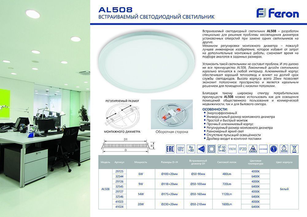 Встраиваемый светодиодный светильник Feron AL508 6W 4000K регулируемый монтажный диаметр 29725 по цене 281 руб. с фотографией и техническими характеристиками. Для покупки товара нажмите кнопку "Купить" и перейдите в корзину или позвоните по телефону 8 (495) 585 32 60 или 8 (800) 222 23 53.