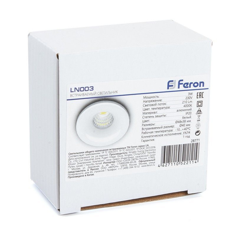 Для подсветки рабочей зоны кухни, рабочего стола, шкафа, трюмо, зеркала в прихожей, а также для подсветки лестничного марша, выставочных экспозиций и витрин. Встраиваемый светильник можно устанавливать в натяжной, подвесной, гипсокартоновый или другие виды потолков. Скрытый монтаж позволяет спрятать основной механизм светильника. Модель из линейки LN003 от производителя Feron с типом лампы Встроенные диоды LED и цветом Белый идеально подойдет для любого интерьера