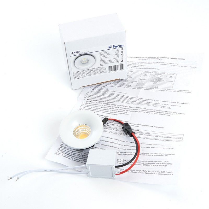 Светильник встраиваемый светодиодный, для подсветки мебели (ДВБ) FERON LN003, 3W 4000К (белый), 230V, 210Lm, IP20, цвет белый, корпус алюминий, рассеиватель акриловый полимер, 48*48*38 мм, монтажн.отв. 40 мм.