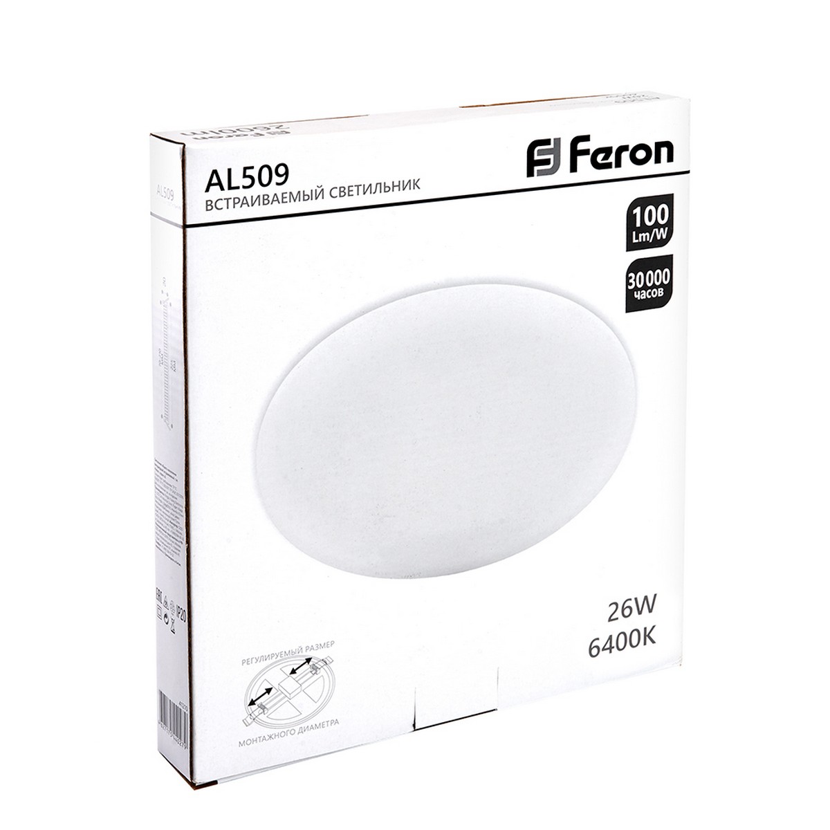 Светильники светодиодные с регулируемым монтажным диаметром, ультратонкий (ДВО) FERON AL509, 26W 6400К (дневной), 175-265V, 2600Lm, IP20, угол рассеивания 120°, цвет белый, корпус алюминий, рассеиватель пластик, 225*225*20 мм, монтажн.отв. 50*50 мм.
