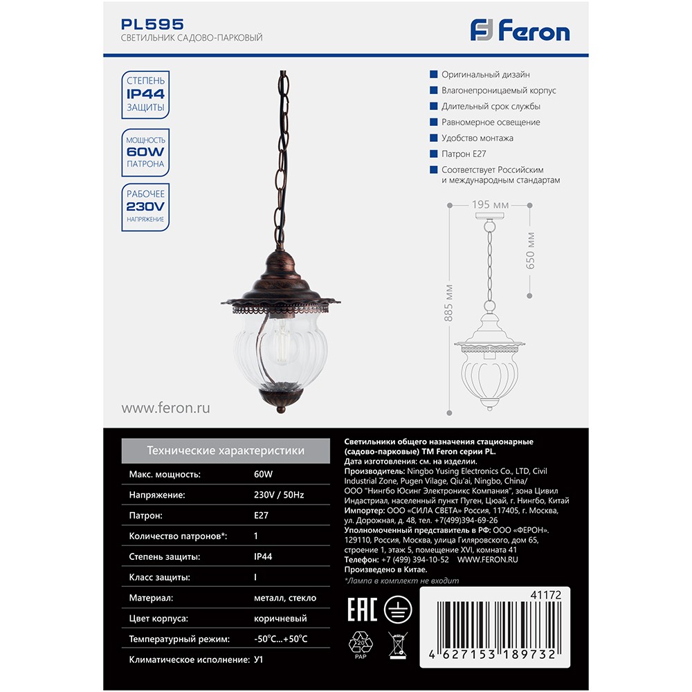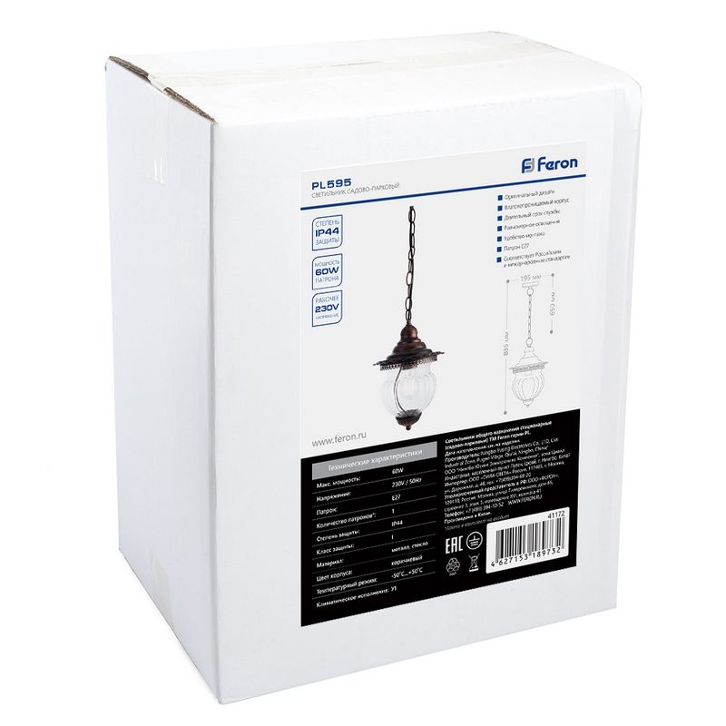 Светильник садово-парковый Feron PL595 на цепочке 60W 230V E27 коричневый 41172 по цене 4 291 руб. с фотографией и техническими характеристиками. Для покупки товара нажмите кнопку "Купить" и перейдите в корзину или позвоните по телефону 8 (495) 585 32 60 или 8 (800) 222 23 53.