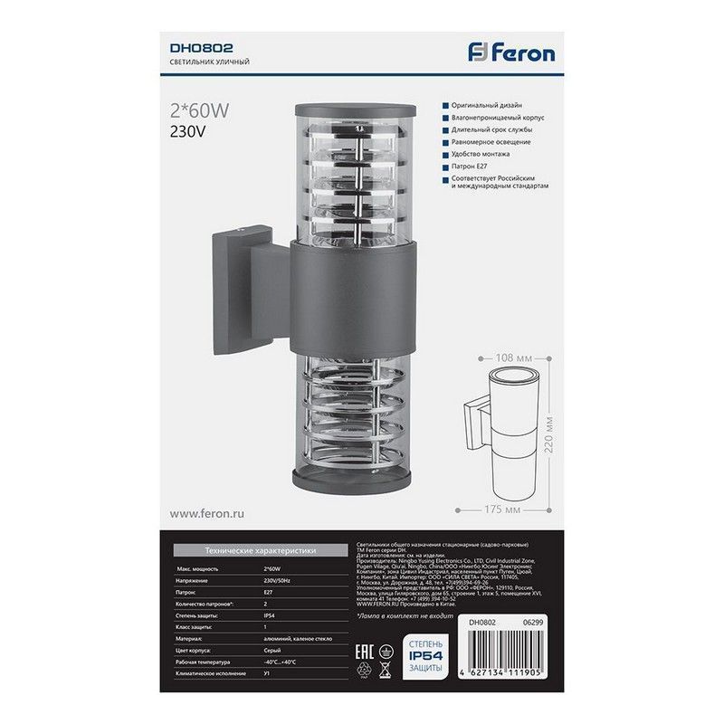 Светильник садово-парковый Feron DH0802 на стену вверх/вниз 2*E27 230V серый 6299 по цене 1 624 руб. с фотографией и техническими характеристиками. Для покупки товара нажмите кнопку "Купить" и перейдите в корзину или позвоните по телефону 8 (495) 585 32 60 или 8 (800) 222 23 53.