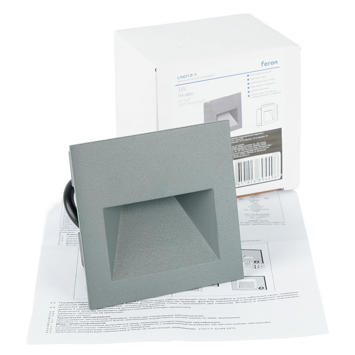 Светильник встраиваемый светодиодный, для лестничной подсветки (ДВУ) FERON LN013-1, 3W 4000К (белый натуральный), 110-265V, 80Lm, IP65, цвет серый, корпус алюминий, пластик, рассеиватель стекло, 86*86*63 мм, монтажн.отв. 68*68 мм.