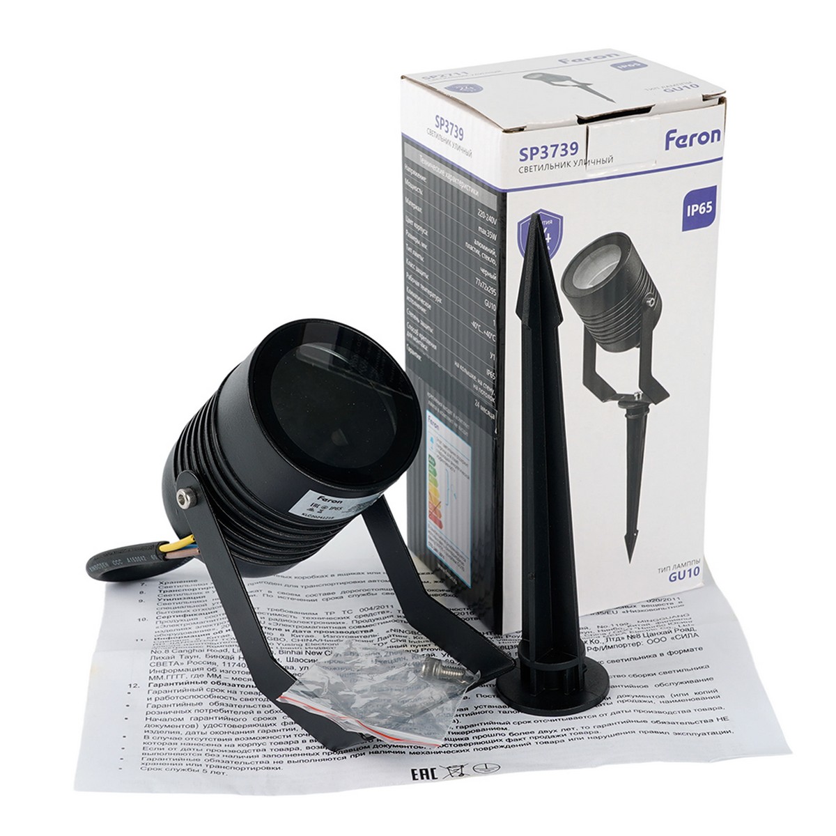 Тротуарный светильник GU10, на колышке (ДВУ) FERON SP3739, 220-240V/50Гц, IP65, класс защиты 1, раб.t -40°C...+40°C, цвет черный, корпус алюминий, пластик, стекло, 77*72*295мм,