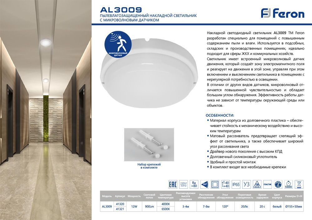 Светильник светодиодный Feron AL3009 12W с микроволновым датчиком 4000K IP65 белый 41320 по цене 646 руб. с фотографией и техническими характеристиками. Для покупки товара нажмите кнопку "Купить" и перейдите в корзину или позвоните по телефону 8 (495) 585 32 60 или 8 (800) 222 23 53.