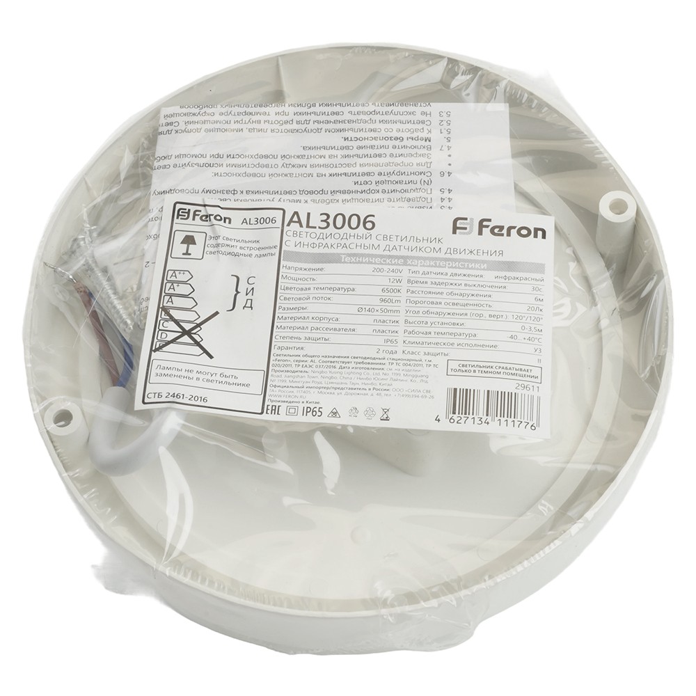 Светильник светодиодный пылевлагозащищённый Feron AL3006 с ИК-датчиком 12W 6500K IP65 белый 29611 по цене 688 руб. с фотографией и техническими характеристиками. Для покупки товара нажмите кнопку "Купить" и перейдите в корзину или позвоните по телефону 8 (495) 585 32 60 или 8 (800) 222 23 53.