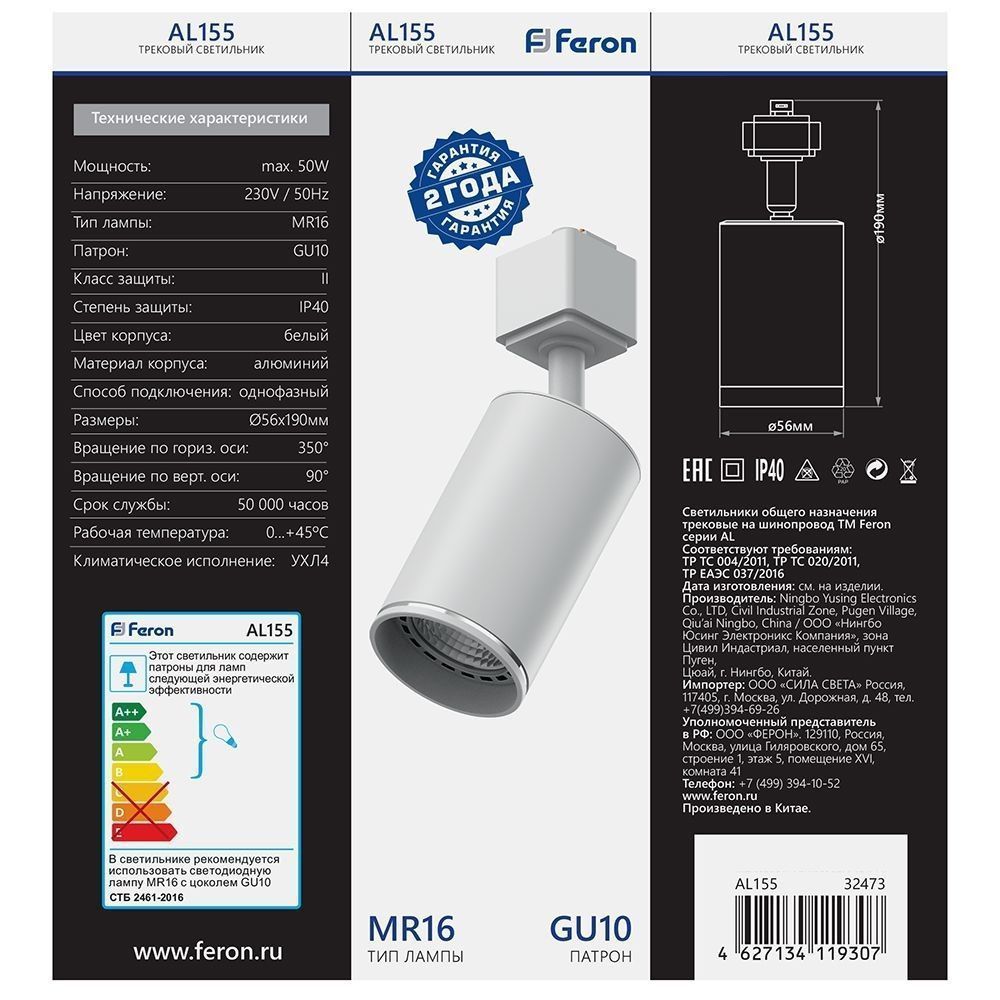 Светильник Feron AL155 трековый однофазный на шинопровод под лампу GU10 белый 32473 по цене 327 руб. с фотографией и техническими характеристиками. Для покупки товара нажмите кнопку "Купить" и перейдите в корзину или позвоните по телефону 8 (495) 585 32 60 или 8 (800) 222 23 53.