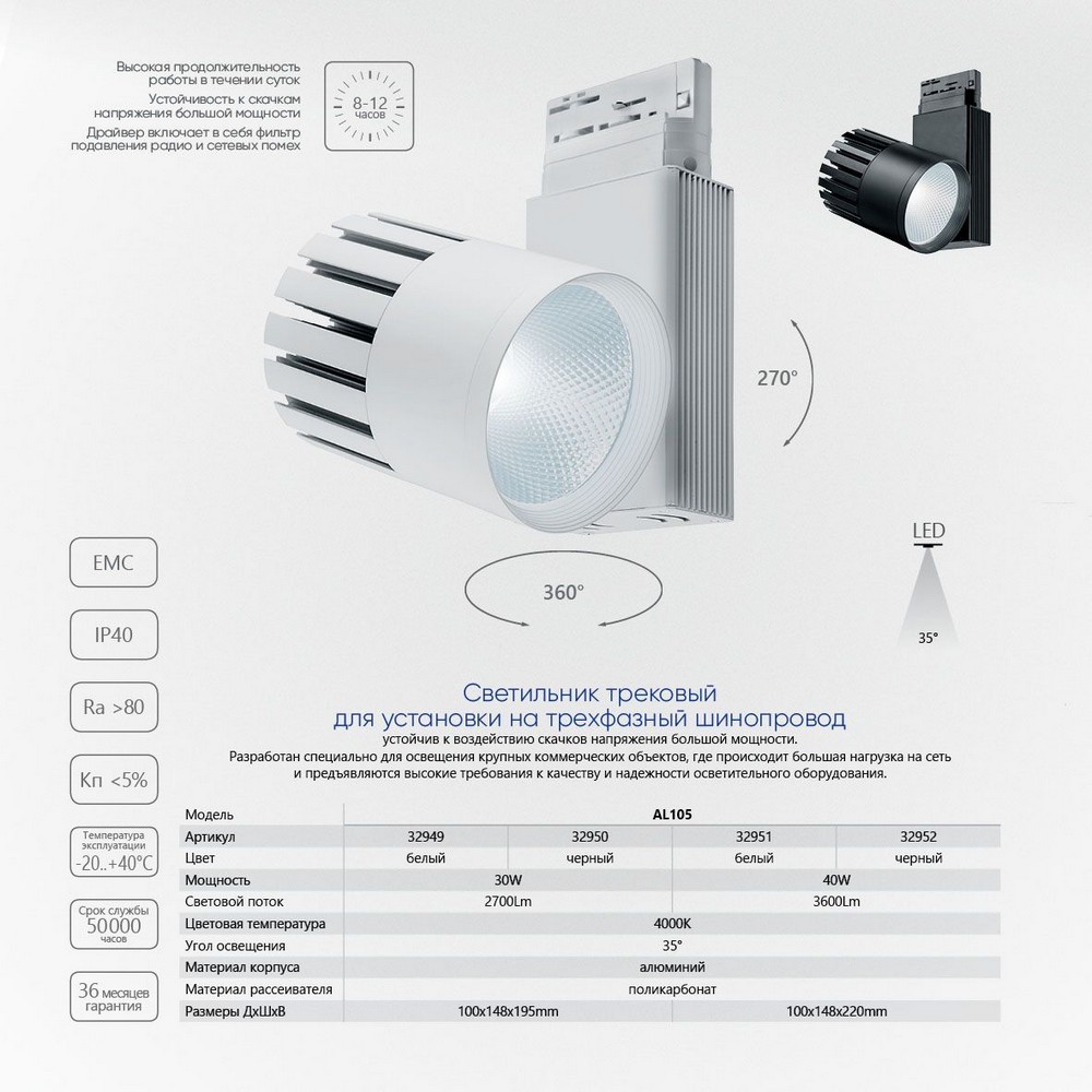 Трековый светильник можно двигать по шинопроводу в любое место трека, есть дополнительные регулировки, можно создавать зоналное освещение. Подходит для основного и декоративного освещения. Модель AL105 от производителя Feron с цветом корпуса Черный подходят для следующего типа трекового освещения - Однофазные трековые системы в качестве источника света используется Встроенные диоды LED. Светильник поможет создать качественное освещение в любом интерьере Светильник трековый на шинопровод, трехфазный (ДПО) FERON AL105, 30W, 4000К (белый), 170-265V, 2700Lm, цвет черный, корпус алюминий, рассеиватель поликарбонат, вращение →360°/↓270°, 100*148*195 мм