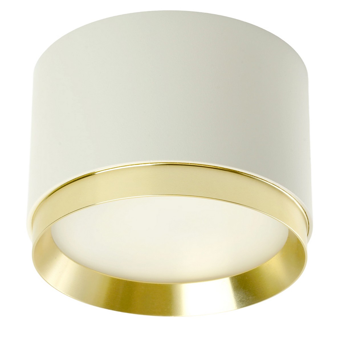 Корпус потолочного накладного светильника выполнен в белом матовом цвете, внутренняя часть - в трендовом цвете золотистого фольгирования. В светильнике используются сменные лампы с цоколем GU10: смену лампы можно осуществить за счет съемного верхнего корпуса.