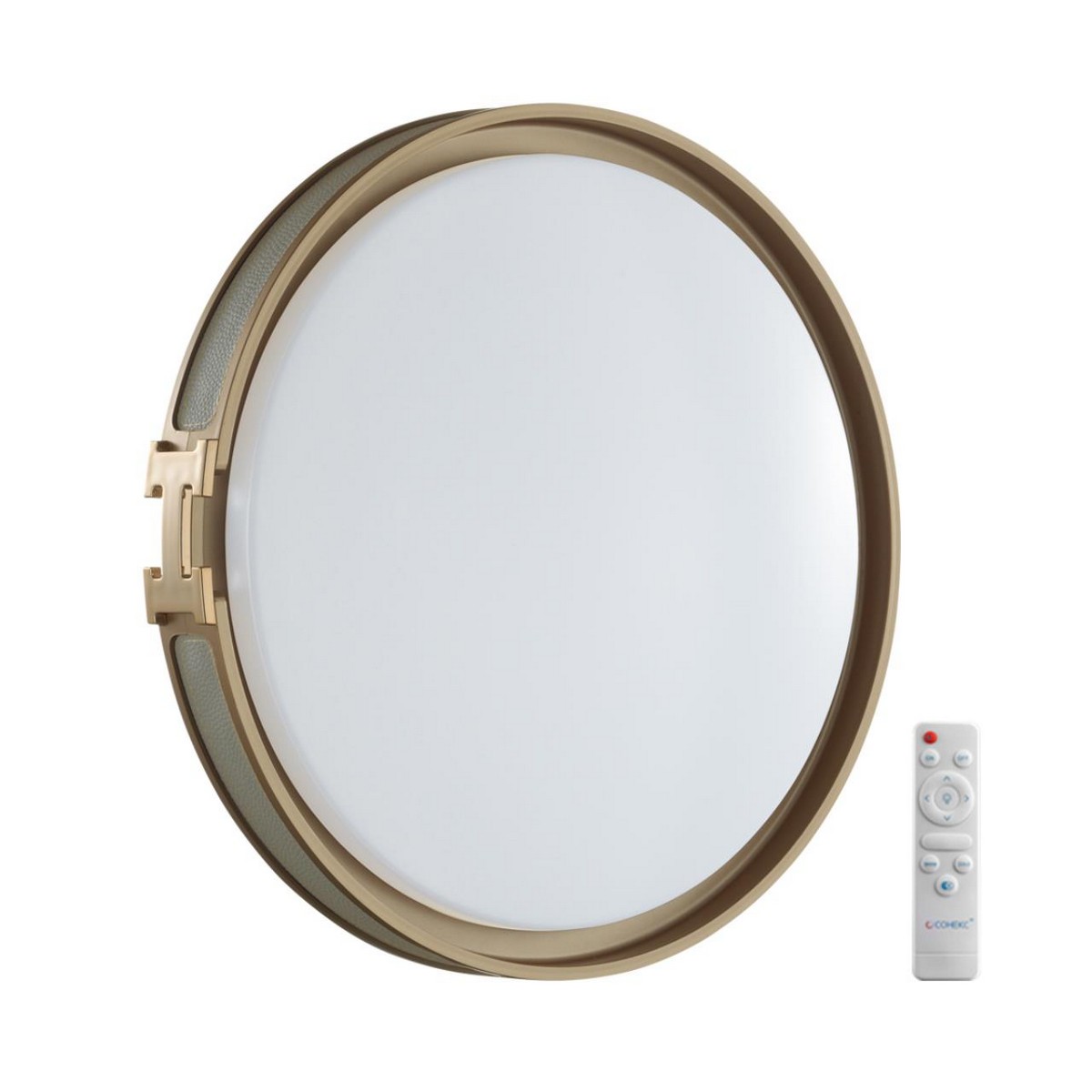 Светильник 7654/EL линии FAVEMO GREY состоит из металлического основания (базы) и пластикового рассеивателя. Материал рассеивателя - высококачественный пластик марки PMMA 2.0 белого цвета с матовой поверхностью. Пластик обеспечивает светильнику равномерное рассеивание и хорошее светопропускание. Форма плафона: круглая, декорирована ободом из искусственной кожи серого цвета. Обод украшен декоративной вставкой в виде пряжки ремня из пластика, цвет золото. Степень защиты IP43 позволяет использовать светильник в определенных зонах влажных помещений. В комплект входит заменяемый LED модуль с линзами, мощностью 70Вт, которая соответствует лампе накаливания 610Вт. А также пульт ДУ (с креплением на стену), с помощью которого осуществляется плавное изменение цветовой температуры 3000-6000К, изменение яркости, переход в режим переключения теплого/белого/холодного/ночного света. Светильник имеет функцию "память".
