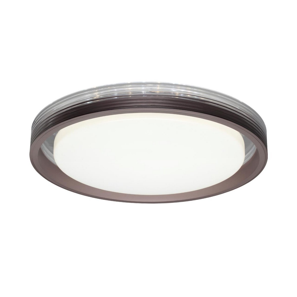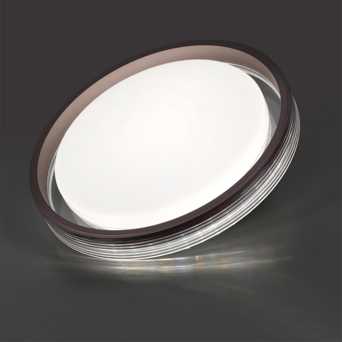Светильник 7698/DL линии MEDEN состоит из металлического основания (базы) и пластикового рассеивателя. Материал рассеивателя - высококачественный пластик марки PMMA 2.0 белого цвета с матовой поверхностью, без текстуры. Пластик обеспечивает светильнику равномерное рассеивание и хорошее светопропускание. Форма плафона: круглая, декорирована многослойным ободом из пластика цвета кофе у края плафона и прозрачного цвета у его основания. Степень защиты IP43 позволяет использовать светильник в определенных зонах влажных помещений. В комплект входит заменяемый LED модуль с линзами, мощностью 48Вт, которая соответствует лампе накаливания 440Вт. А также пульт ДУ (с креплением на стену), с помощью которого осуществляется плавное изменение цветовой температуры 3000-6000К, изменение яркости, переход в режим переключения теплого/белого/холодного/ночного света. Светильник имеет функцию "память".