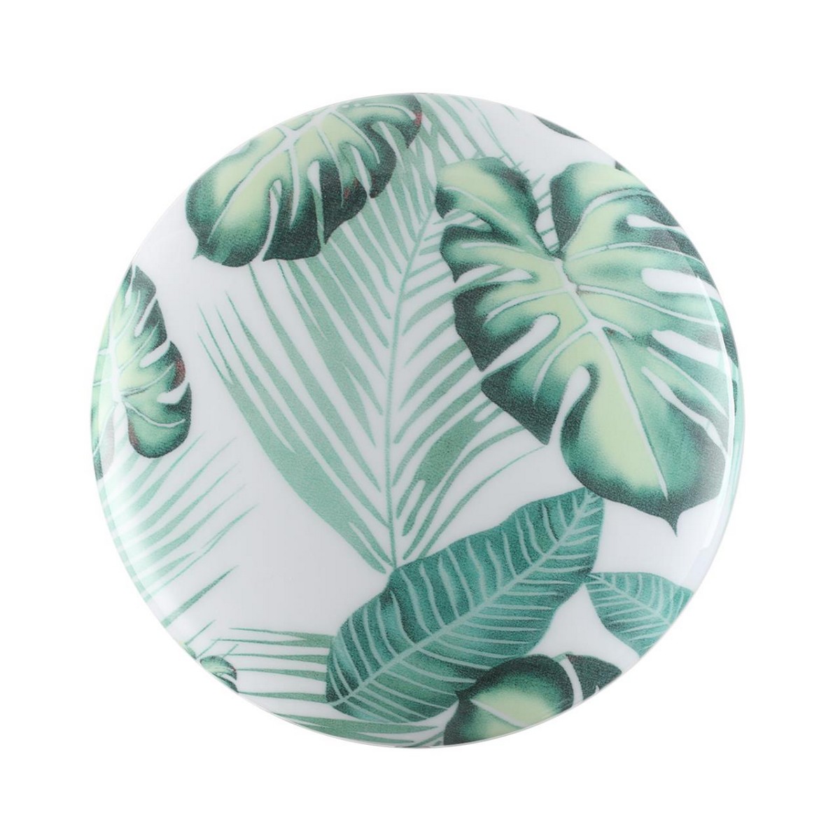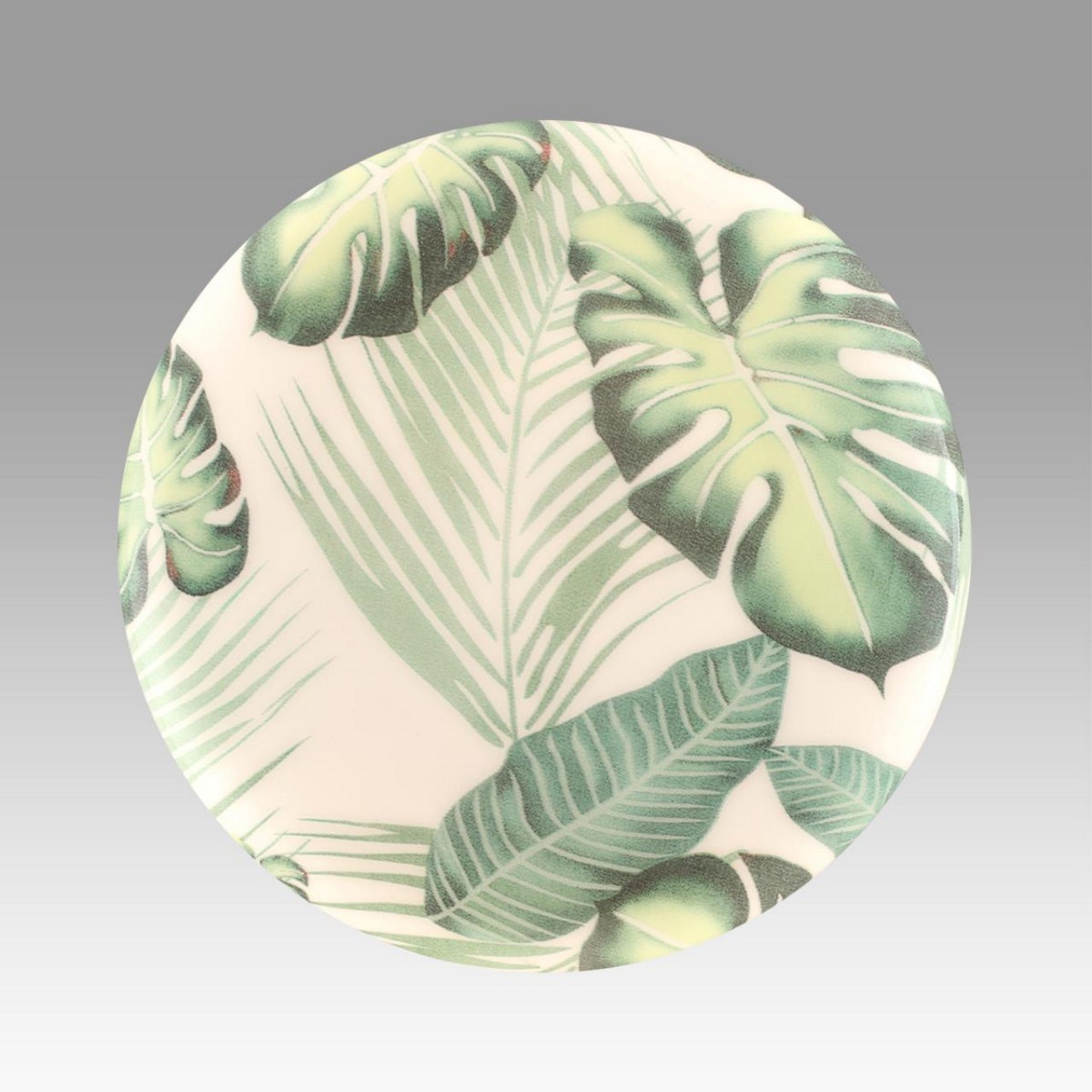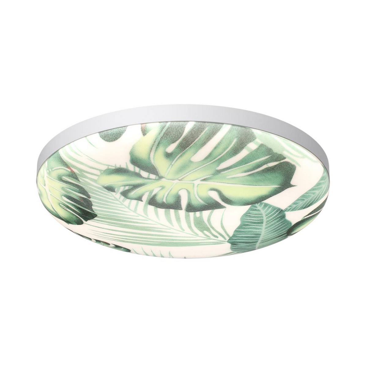 Светильник 7748/DL линии FLORI состоит из металлического основания (базы) и пластикового рассеивателя. Материал рассеивателя - высококачественный пластик марки PMMA 2.0 белого цвета с глянцевой поверхностью, обеспечивающий светильнику равномерное рассеивание и хорошее светопропускание. Форма плафона: круглая, декорирована орнаментом на плафоне с зеленым рисунком тропических листьев и съемным ободом белого цвета. Рисунок на плафоне выполнен методом цифровой печати по технологии прямого нанесения красок на акриловый лист. С целью предотвращения выцветания красок поверх рисунка наносится слой белой краски. После выдувания плафона при высоких температурах красочный рисунок приобретает стойкость и долговечность. Степень защиты IP43 позволяет использовать светильник в определенных зонах влажных помещений. В комплект входит заменяемый LED модуль с линзами, мощностью 48Вт, которая соответствует лампе накаливания 440Вт. А также пульт ДУ, с помощью которого осуществляется плавное изменение цветовой температуры 3000-600