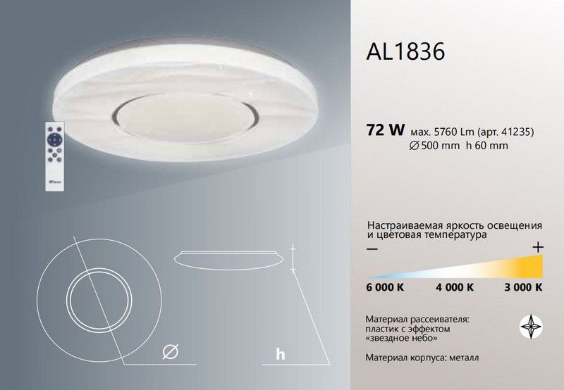 Светодиодный управляемый светильник Feron AL1836 тарелка 72W 3000К-6000K 41235 по цене 3 697 руб. с фотографией и техническими характеристиками. Для покупки товара нажмите кнопку "Купить" и перейдите в корзину или позвоните по телефону 8 (495) 585 32 60 или 8 (800) 222 23 53.
