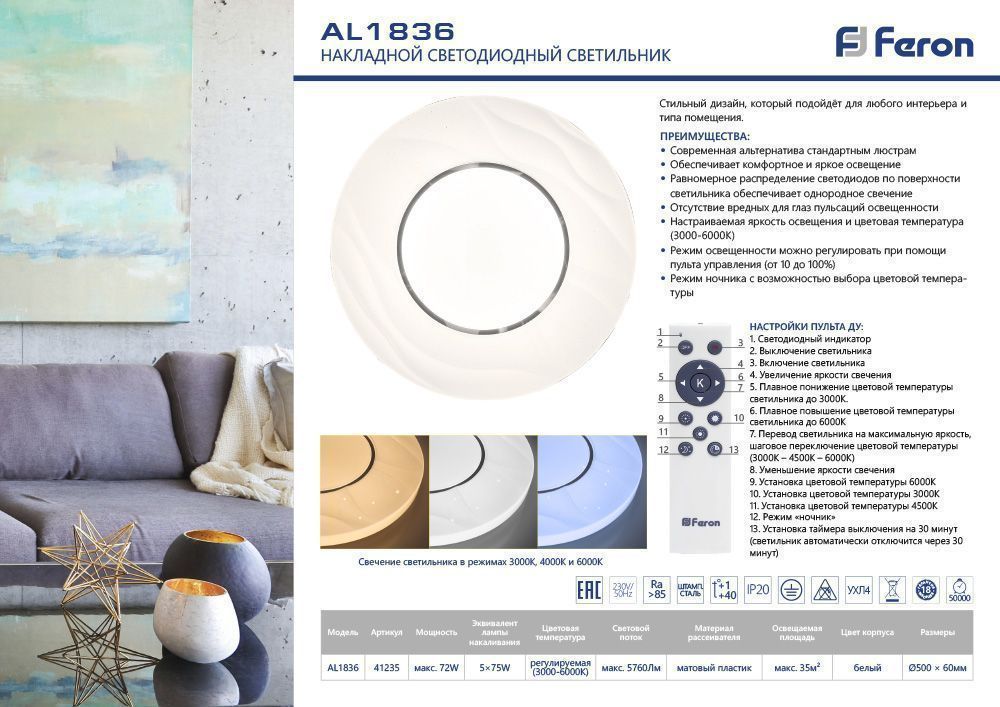 Стильный дизайн светодиодного управляемого светильника Feron AL1836 артикул 41235, который подойдёт для любого интерьера и типа помещения.