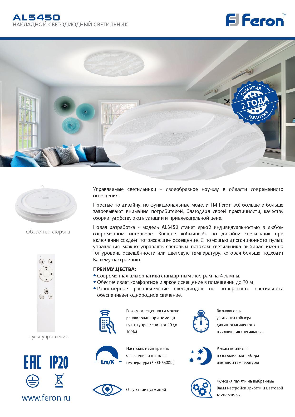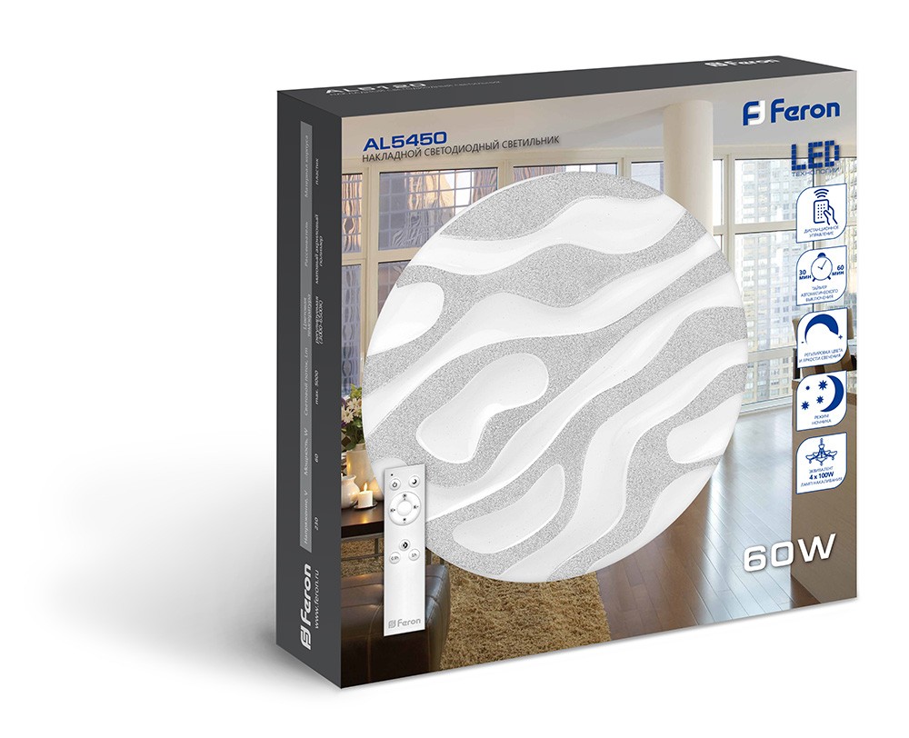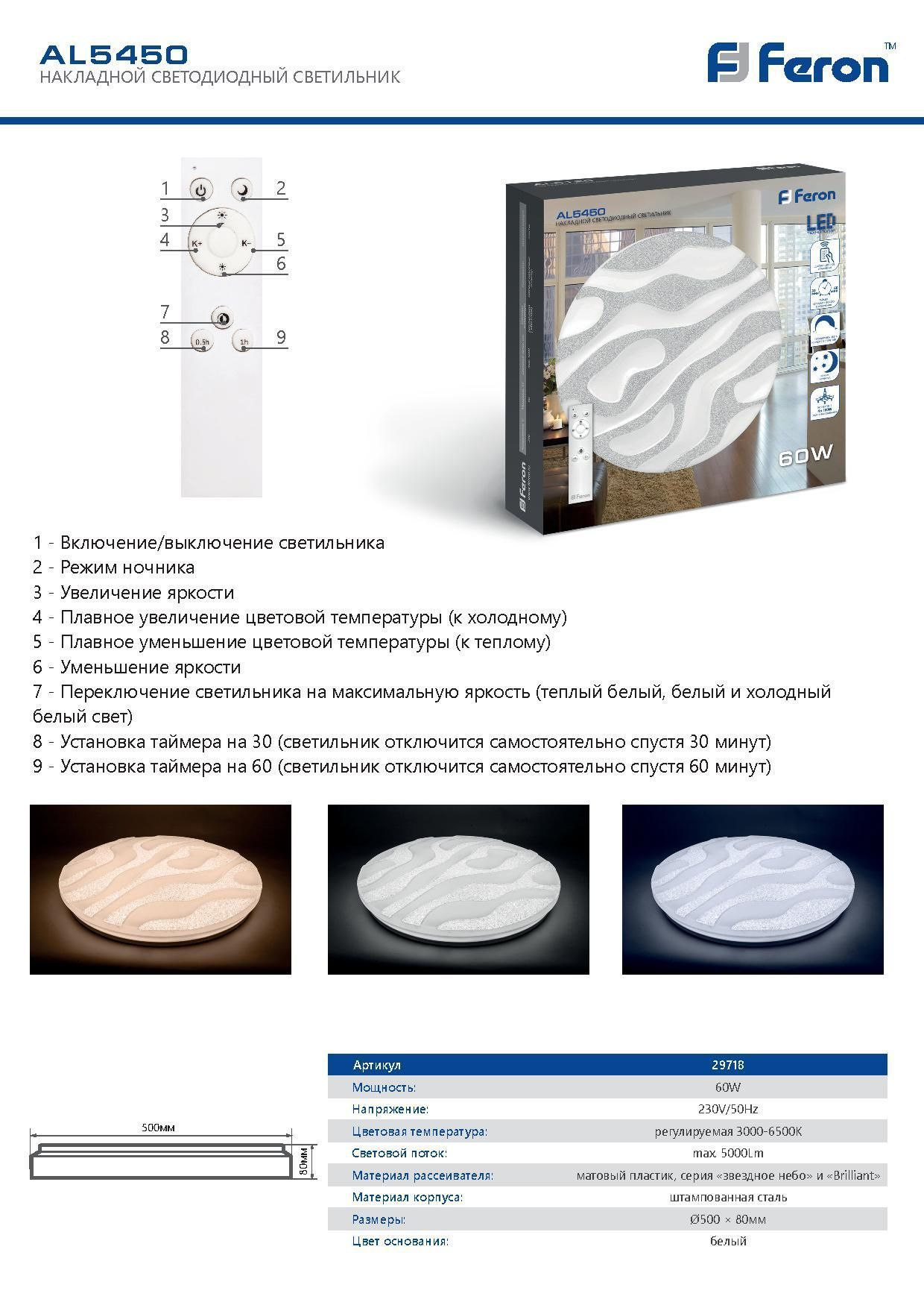 Светодиодный управляемый светильник накладной Feron AL5450 тарелка 60W 3000К-6500K белый 29718 по цене 3 288 руб. с фотографией и техническими характеристиками. Для покупки товара нажмите кнопку "Купить" и перейдите в корзину или позвоните по телефону 8 (495) 585 32 60 или 8 (800) 222 23 53.