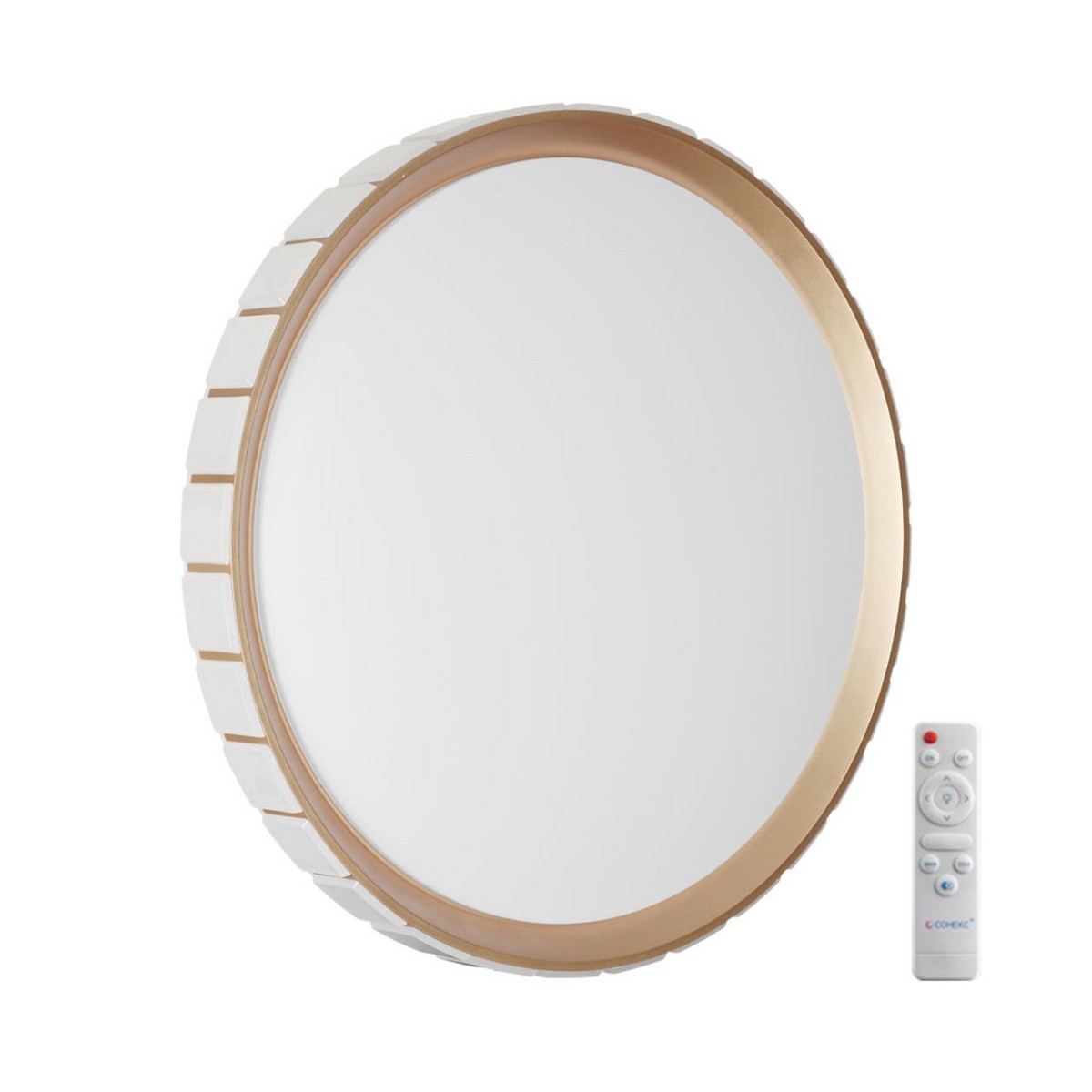 Светильник 7648/DL линии ATABI GOLD состоит из металлического основания (базы) и пластикового рассеивателя. Материал рассеивателя - высококачественный пластик марки PMMA 2.0 белого цвета с матовой поверхностью, без текстуры. Пластик обеспечивает светильнику равномерное рассеивание и хорошее светопропускание. Форма плафона: круглая, декорирована ободом из пластика золотого цвета с объемной структурой. Степень защиты IP43 позволяет использовать светильник в определенных зонах влажных помещений. В комплект входит заменяемый LED модуль с линзами, мощностью 70Вт, которая соответствует лампе накаливания 610Вт. А также пульт ДУ (с креплением на стену), с помощью которого осуществляется плавное изменение цветовой температуры 3000-6000К, изменение яркости, переход в режим переключения теплого/белого/холодного/ночного света. Светильник имеет функцию "память".