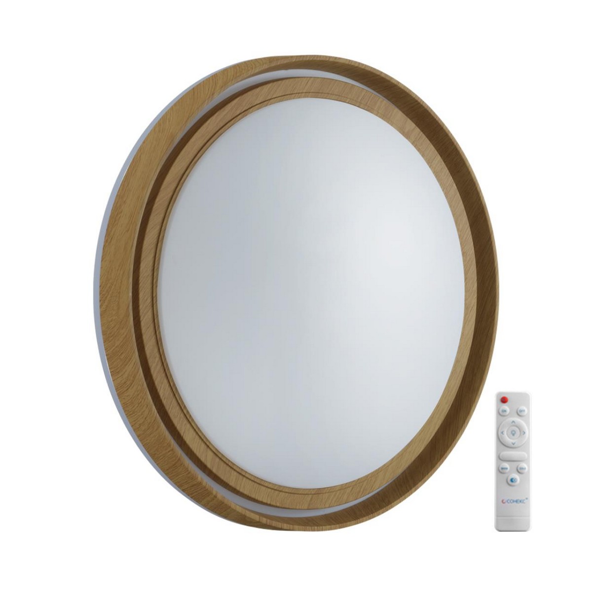 Светильник 7640/EL линии RUX WOOD состоит из металлического основания (базы) и пластикового рассеивателя. Материал рассеивателя - высококачественный пластик марки PMMA 2.0 белого цвета с матовой поверхностью, обеспечивающий светильнику равномерное рассеивание и хорошее светопропускание. Форма плафона: круглая, декорирована ободом "под дерево" из пластика коричневого цвета. Степень защиты IP43 позволяет использовать светильник в определенных зонах влажных помещений. В комплект входит заменяемый LED модуль с линзами, мощностью 70Вт, которая соответствует лампе накаливания 610Вт. А также пульт ДУ (с креплением на стену), с помощью которого осуществляется плавное изменение цветовой температуры 3000-6000К, изменение яркости, переход в режим переключения теплого/белого/холодного/ночного света. Светильник имеет функцию "память".
